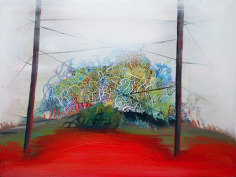 JENNIFER COATES' metaphysical paintings utilize the conventions of landscape as a vehicle for hallucinatory visions and psychological spaces. Expanses of sky or sea coalesce into reflective pools of paint; intricate geometric galaxies warp into ecstatic vortexes, and tiny specs of color form clusters of luminescent light. She contrasts atmospheric radiance with meticulous detail, and iconic directness with allusive abstraction. Varied painterly approaches are positioned against each other to create a disjunctive but idealistic experience of place.