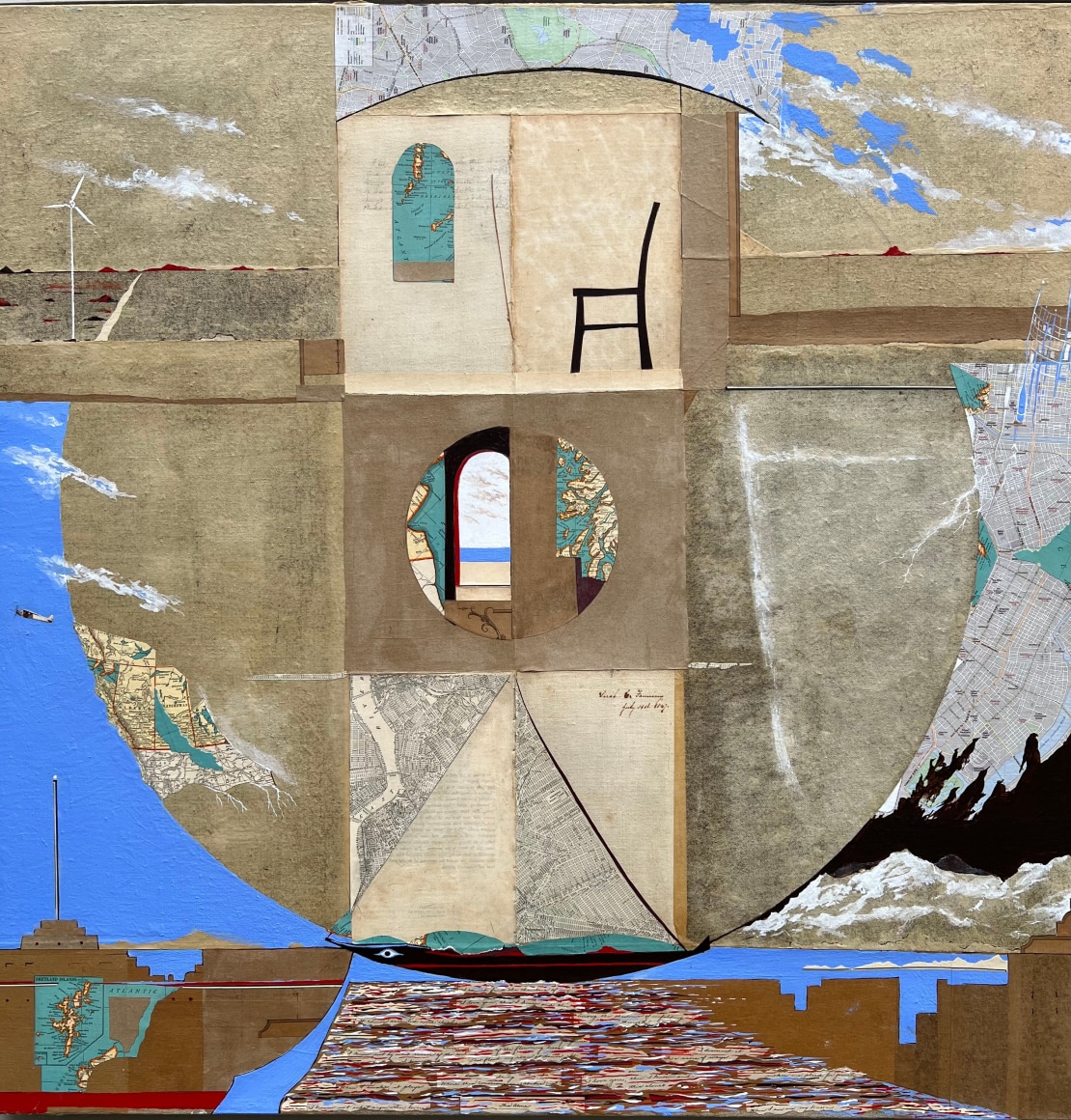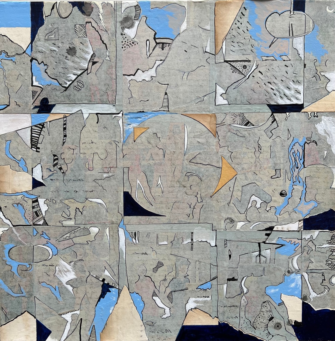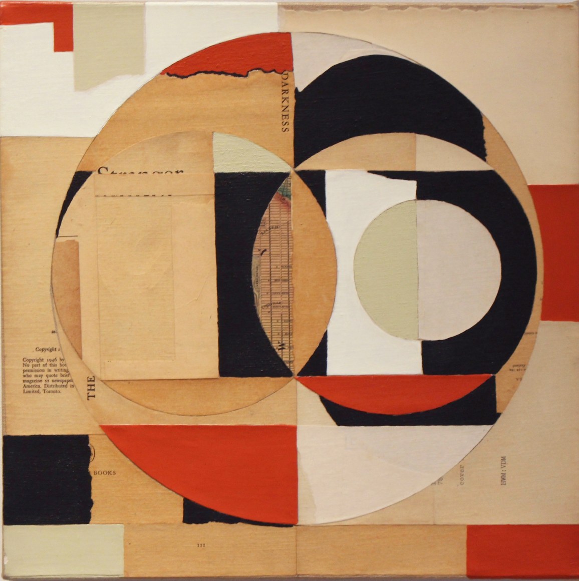 JOHN SPINKS paintings and collages incorporate handwritten letters, sheet music, books pages, comics and maps, and serve to survey a spectrum of sensitive works from quiet Cubist-like abstractions to Pop iconic and graphic mandalas; and from the witty and humorous to the personal and poetic. His recent collages of ocean liners sail on a sea of musical notes, and his small skeleton illustrations are playful vignettes with the reaper.