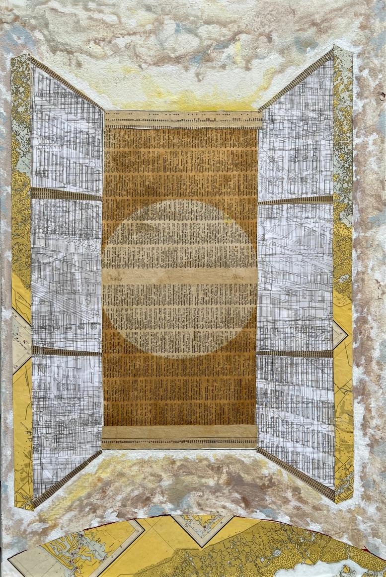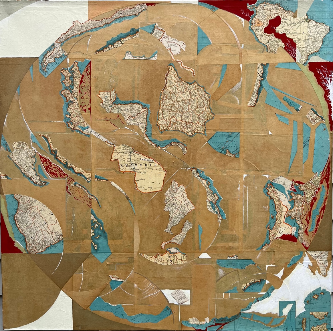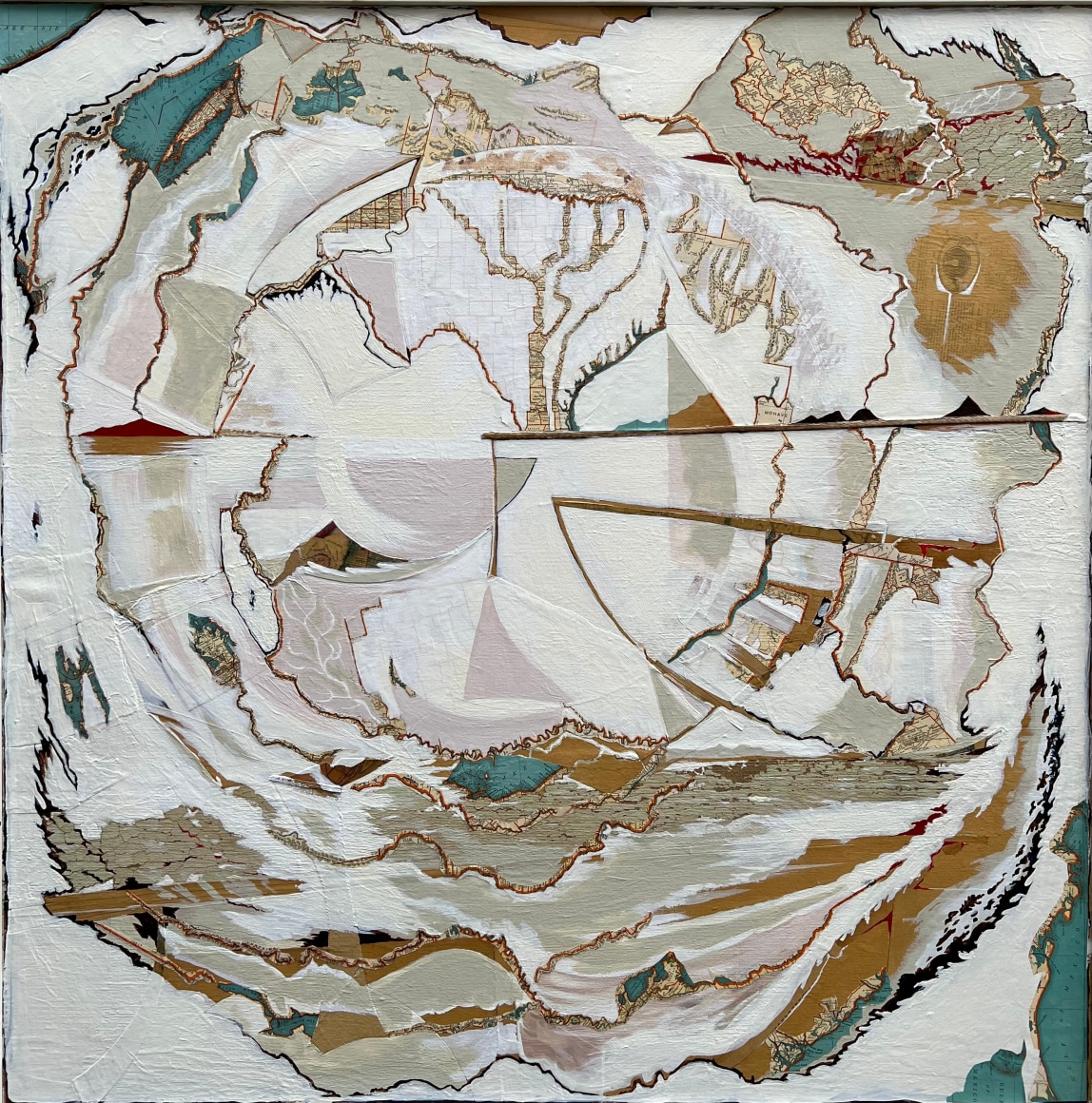 JOHN SPINKS paintings and collages incorporate handwritten letters, sheet music, books pages, comics and maps, and serve to survey a spectrum of sensitive works from quiet Cubist-like abstractions to Pop iconic and graphic mandalas; and from the witty and humorous to the personal and poetic. His recent collages of ocean liners sail on a sea of musical notes, and his small skeleton illustrations are playful vignettes with the reaper.