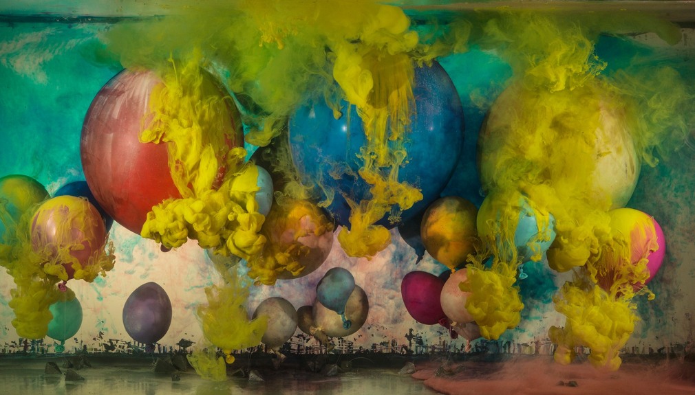 He is also well-known for his large-scale landscape photographs, which are created by meticulously constructing miniature topographies in the empty tank, which is then filled with water. These dioramas of fictitious environments are next brought to life with colored light filters and the dispersal of pigment, producing ephemeral atmospheres that he must quickly capture with his large-format camera.