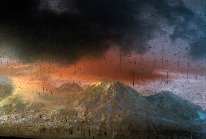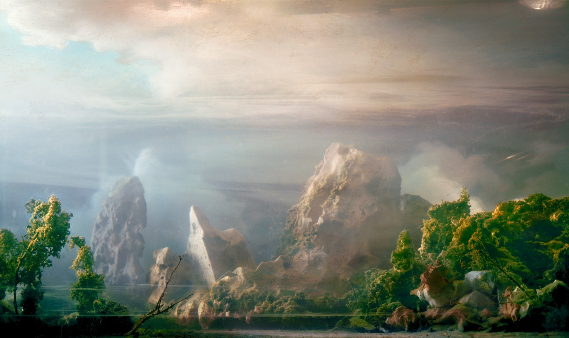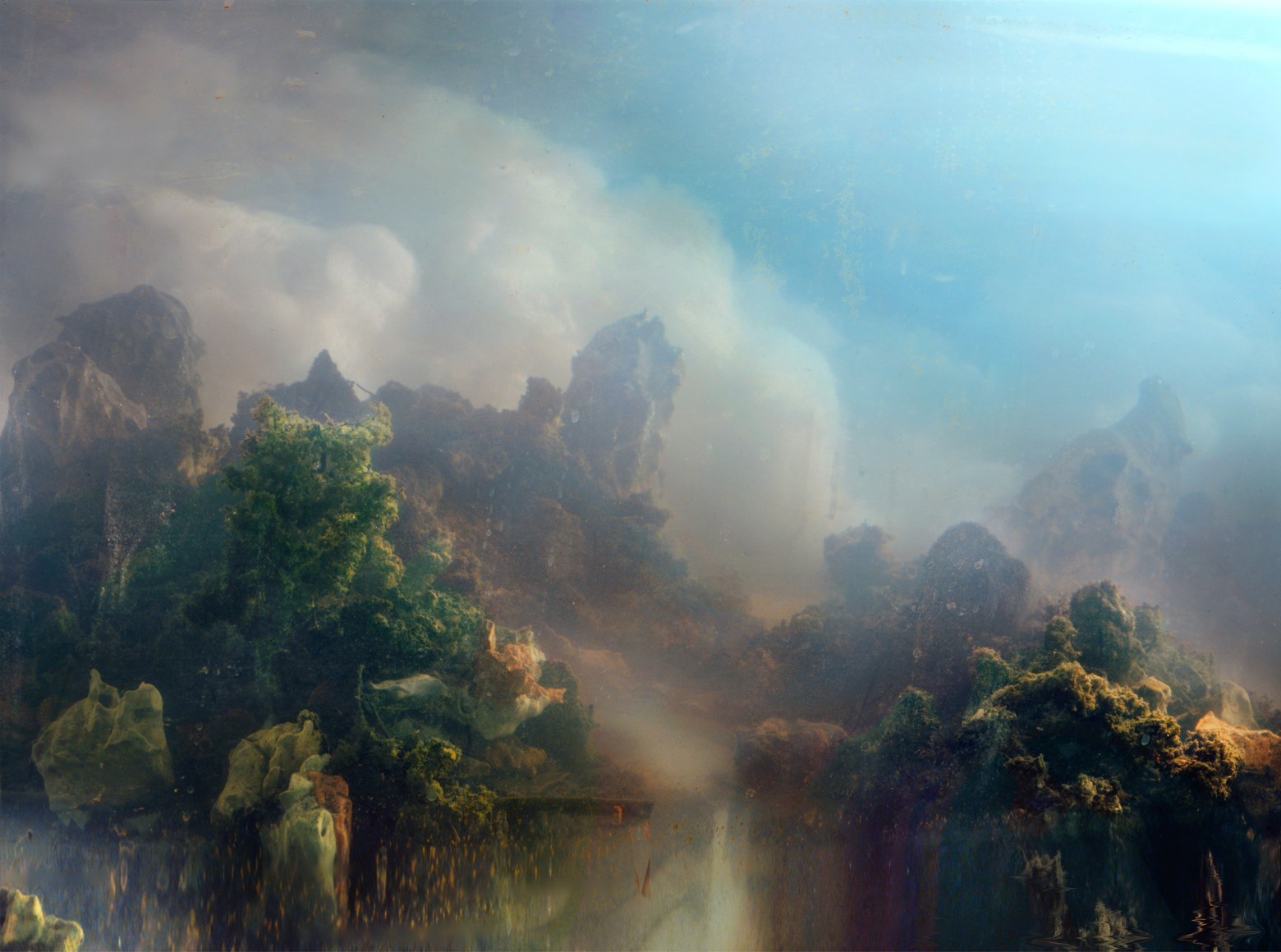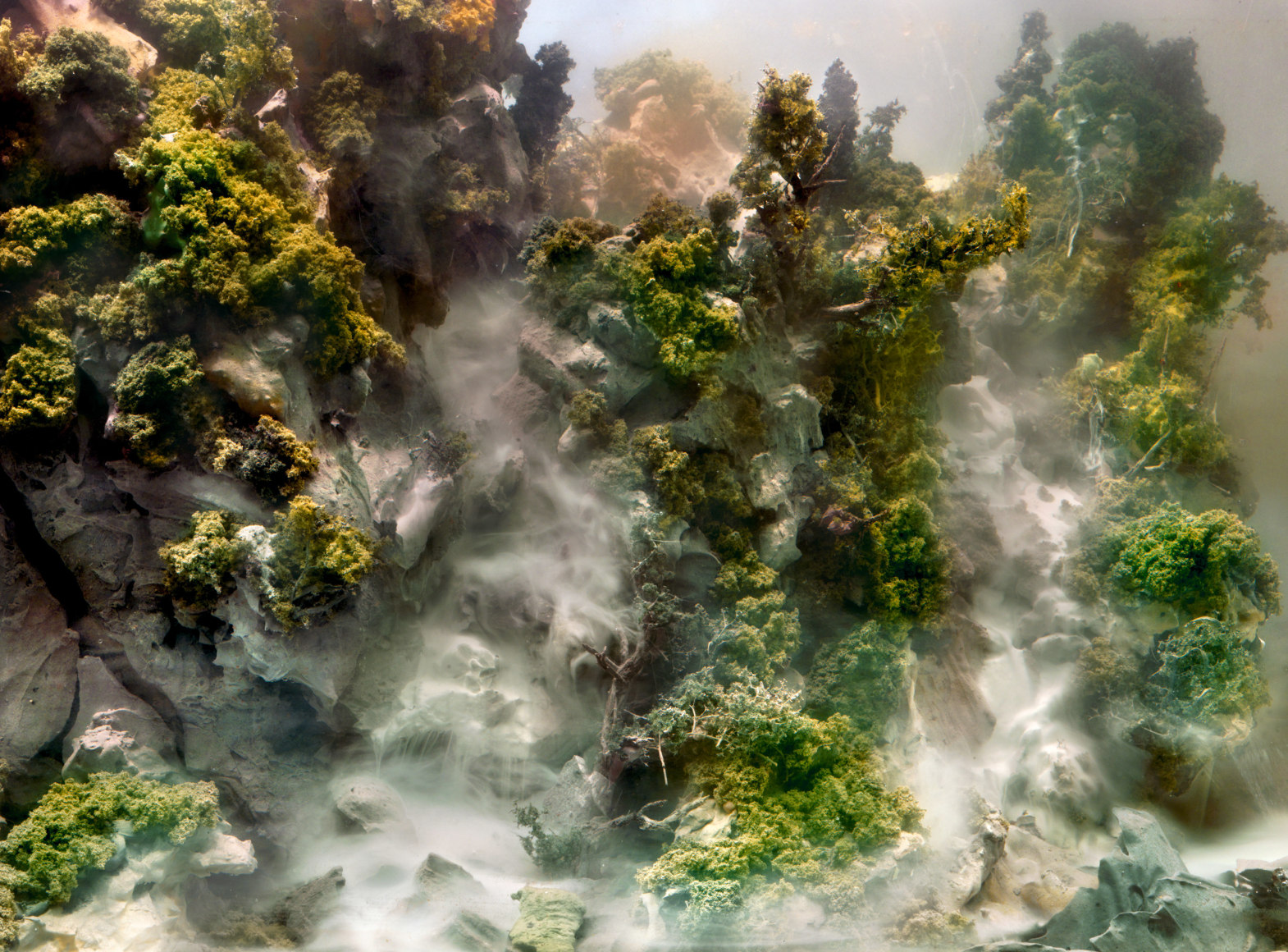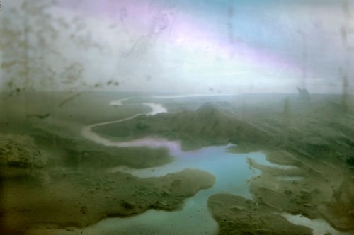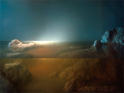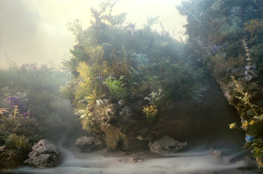 He is also well-known for his large-scale landscape photographs, which are created by meticulously constructing miniature topographies in the empty tank, which is then filled with water. These dioramas of fictitious environments are next brought to life with colored light filters and the dispersal of pigment, producing ephemeral atmospheres that he must quickly capture with his large-format camera.