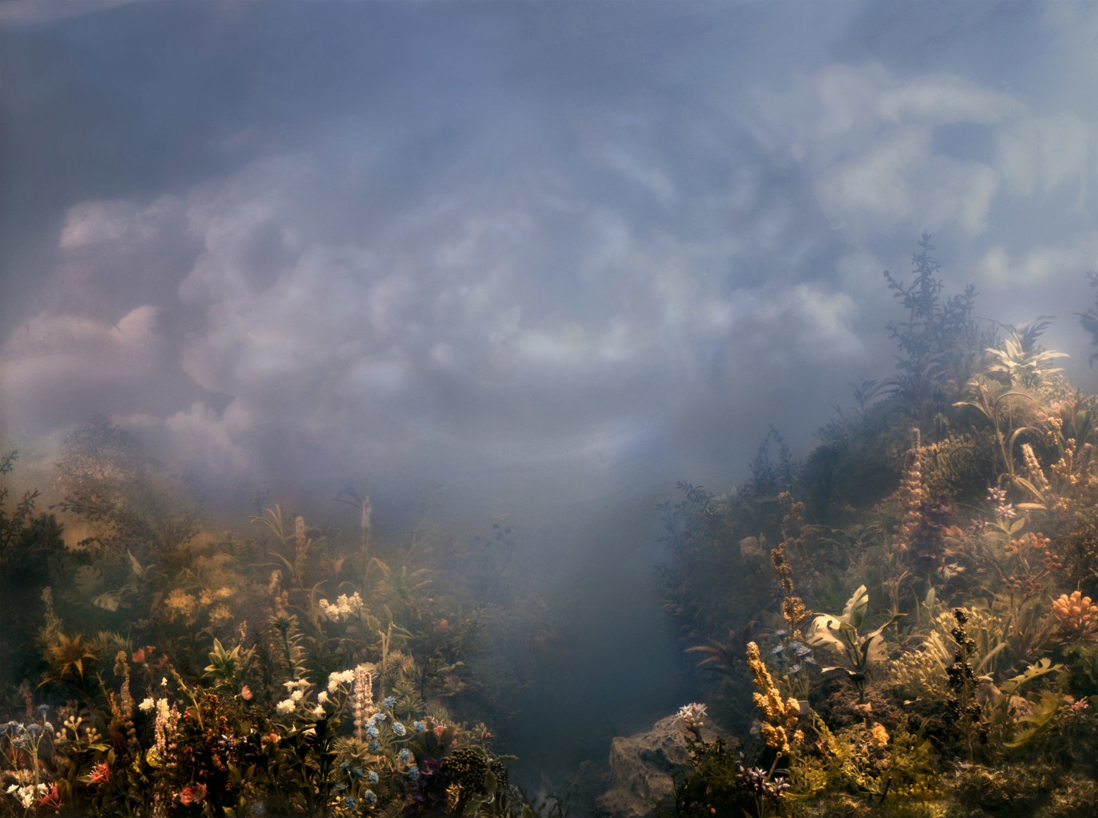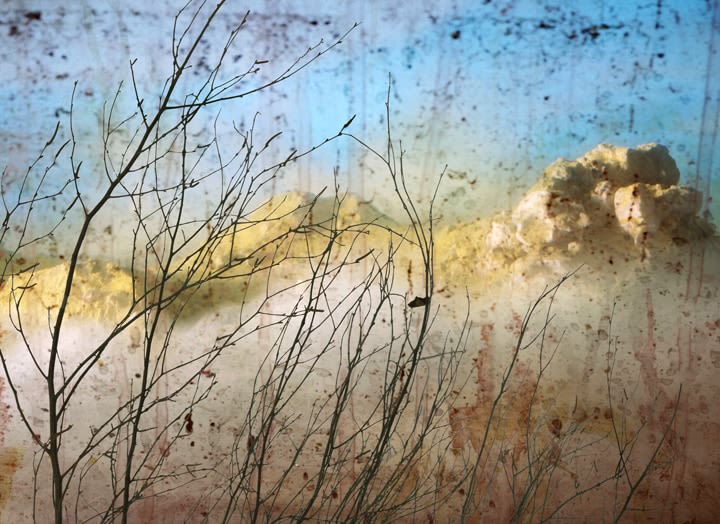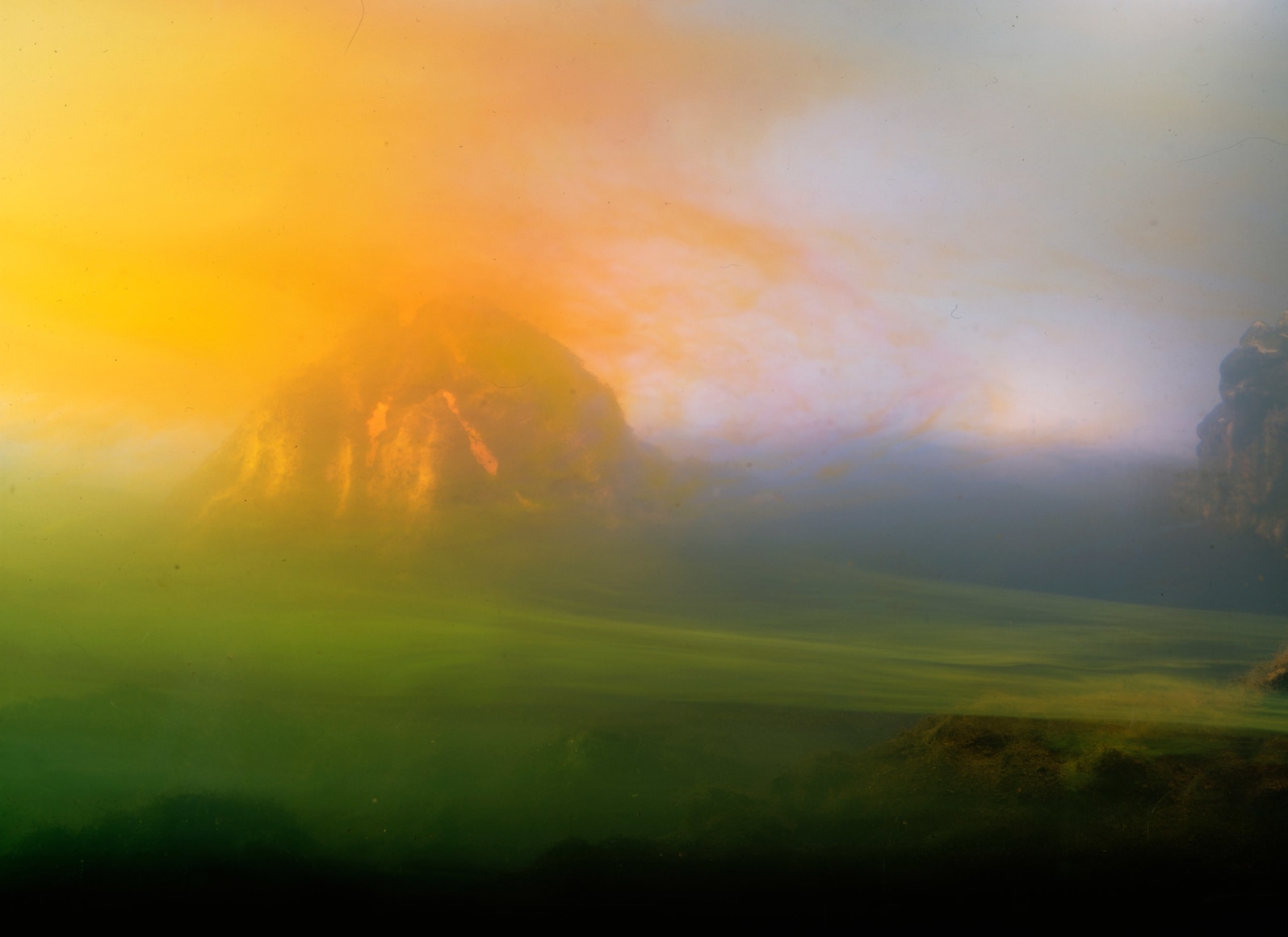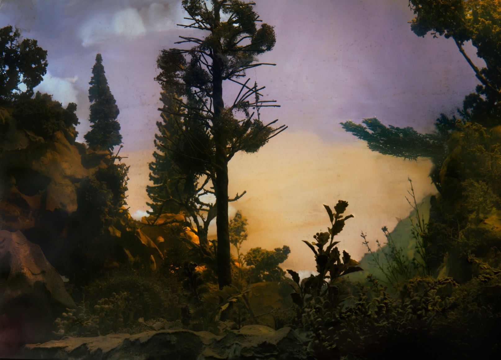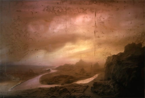 He is also well-known for his large-scale landscape photographs, which are created by meticulously constructing miniature topographies in the empty tank, which is then filled with water. These dioramas of fictitious environments are next brought to life with colored light filters and the dispersal of pigment, producing ephemeral atmospheres that he must quickly capture with his large-format camera.