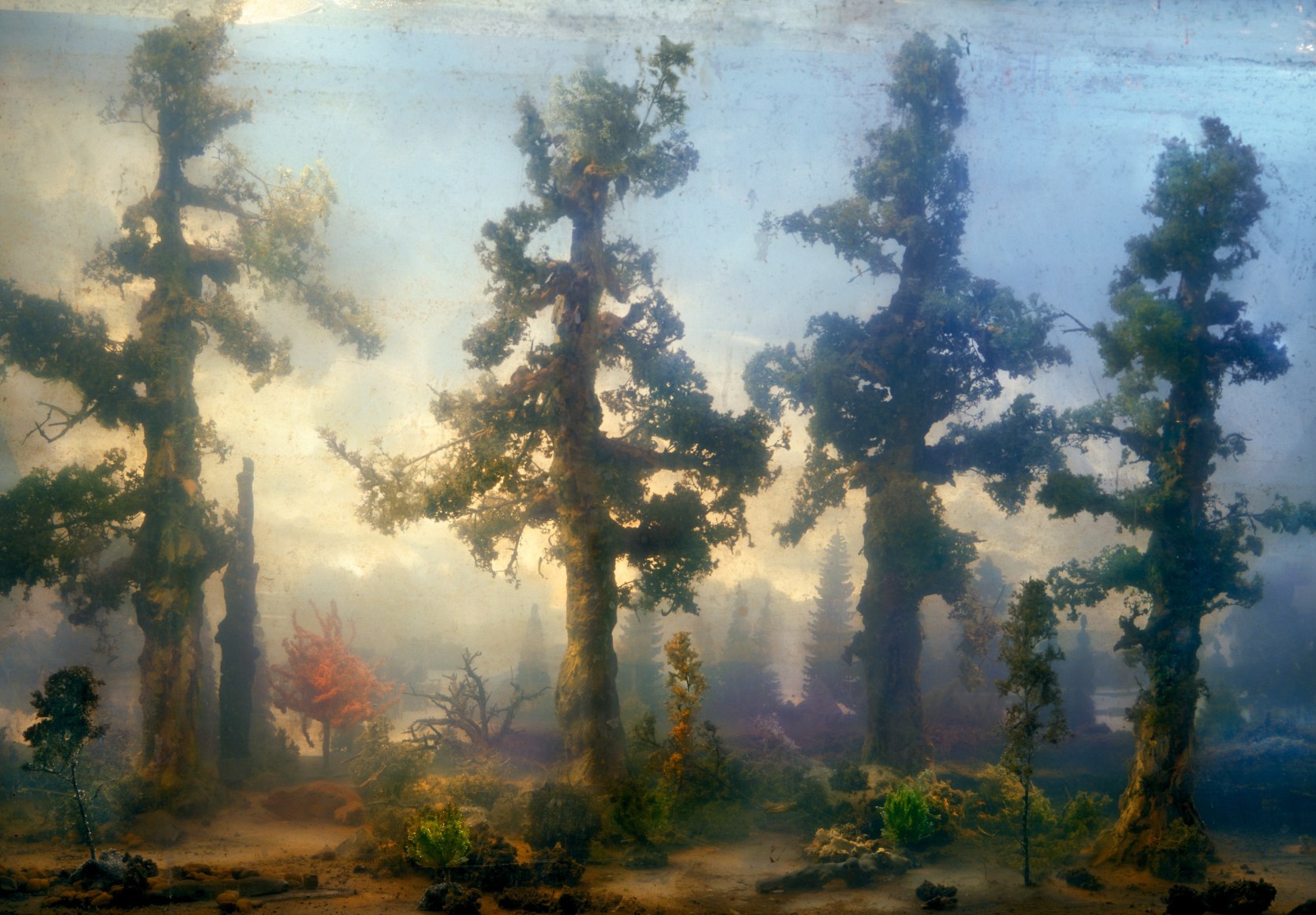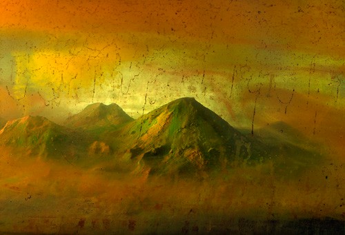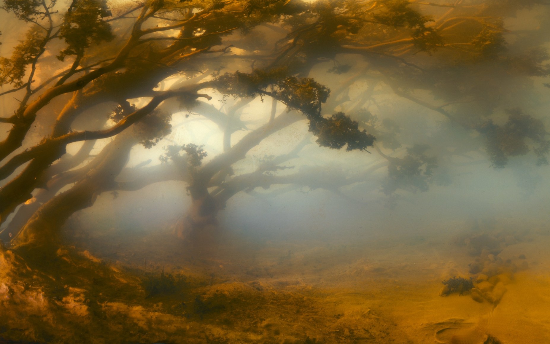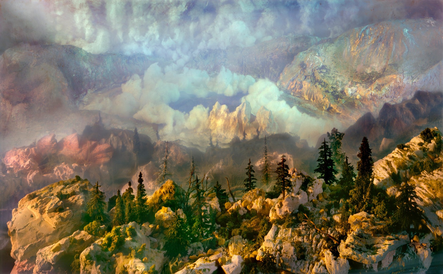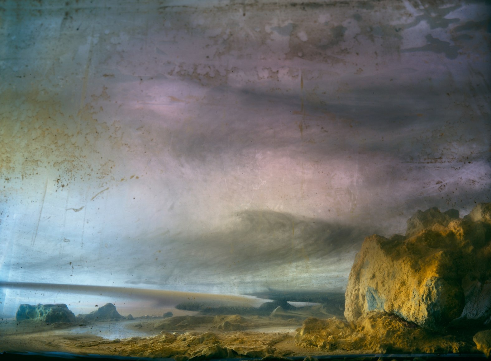 He is also well-known for his large-scale landscape photographs, which are created by meticulously constructing miniature topographies in the empty tank, which is then filled with water. These dioramas of fictitious environments are next brought to life with colored light filters and the dispersal of pigment, producing ephemeral atmospheres that he must quickly capture with his large-format camera.