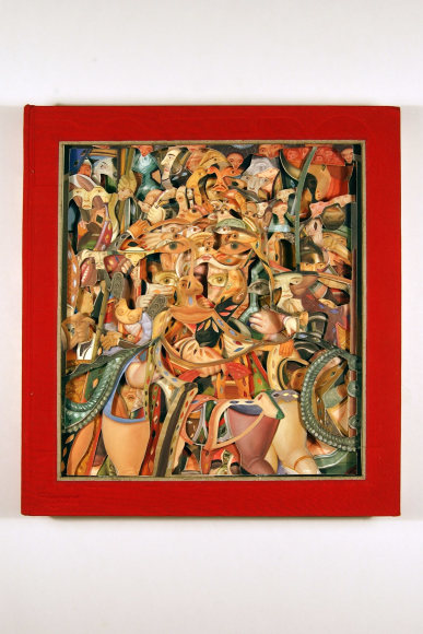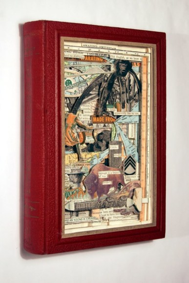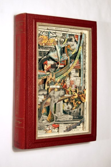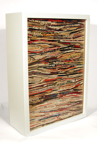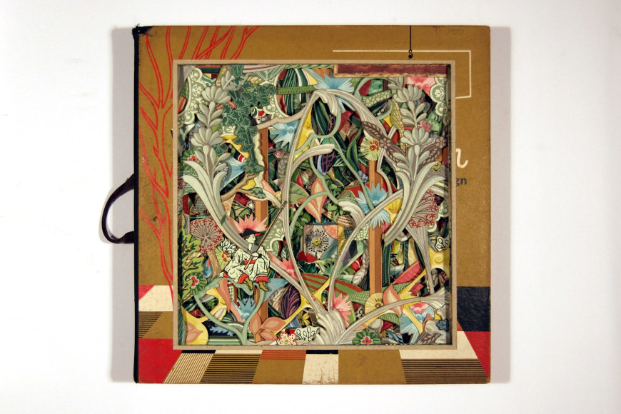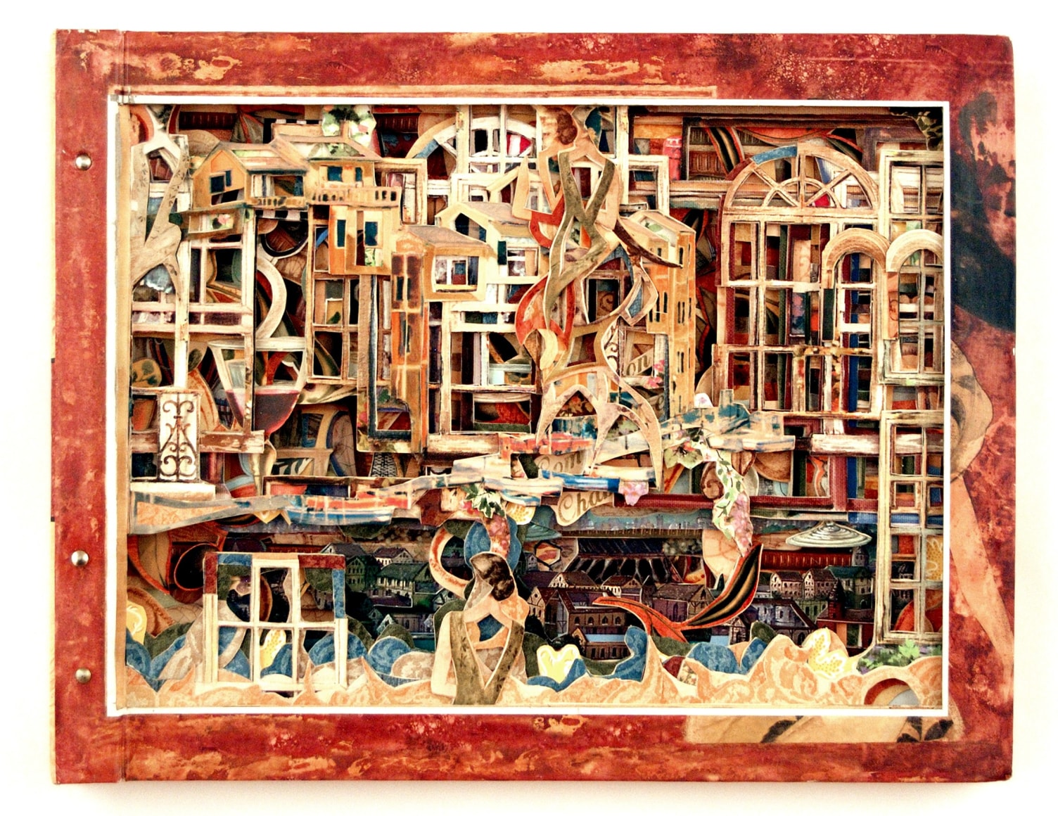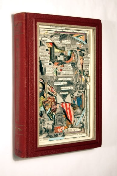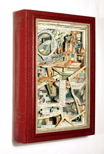 With the precision of a surgeon, Dettmer uses scalpels and tweezers to dissect and rejuvenate sets of encyclopedias, dictionaries, atlases, wallpaper sample books and other forms of rapidly antiquating materials. He does not add content or images, but, rather, pushes the boundaries of the their physical forms to better expose their attributes. The fractured text and layered images that comprise his restructured works evoke the randomness and fragmented nature of history, information and memory.