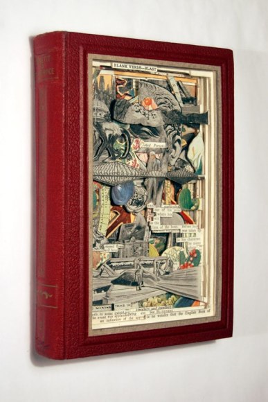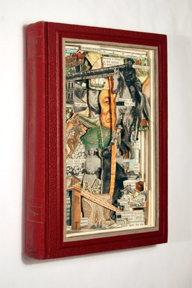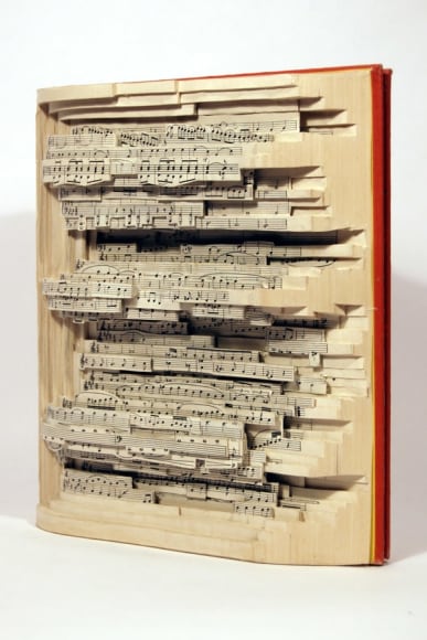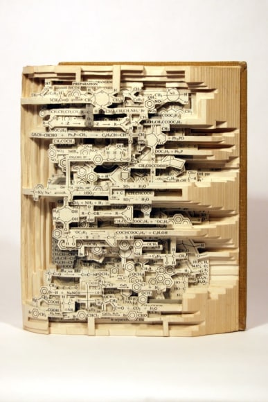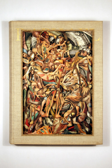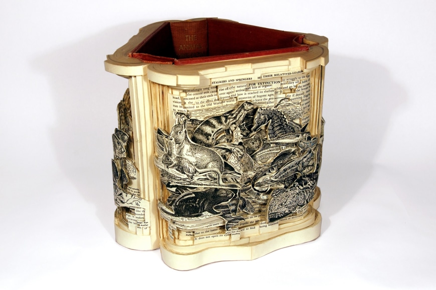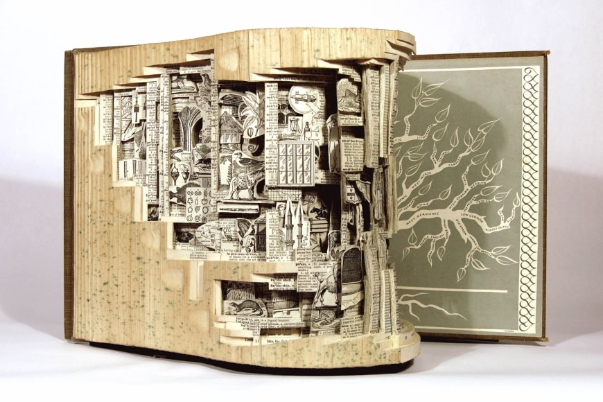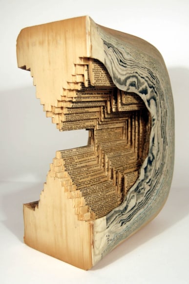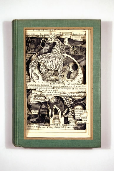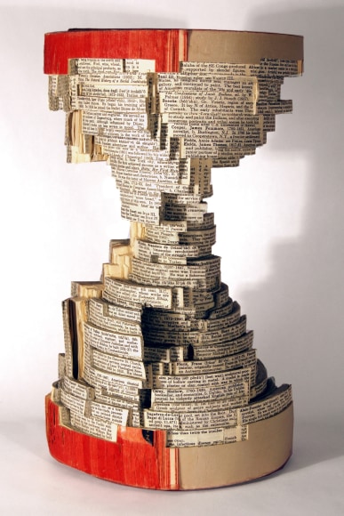 BRIAN DETTMER sifts through stacks of old books to uncover the perfect source and subject for his sculptural examinations. Dettmer treats his book sculptures like archaeological sites by excavating forms and uncovering hidden meanings. He alters pre-existing materials by selectively removing and manipulating elements as a way to allow new interpretations and ideas to emerge.