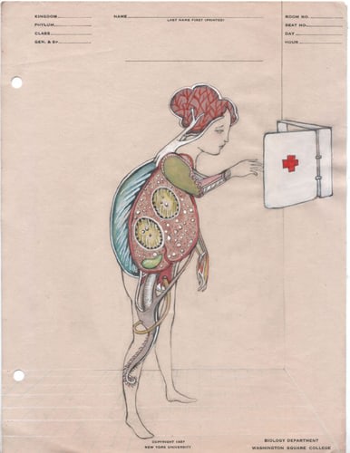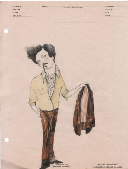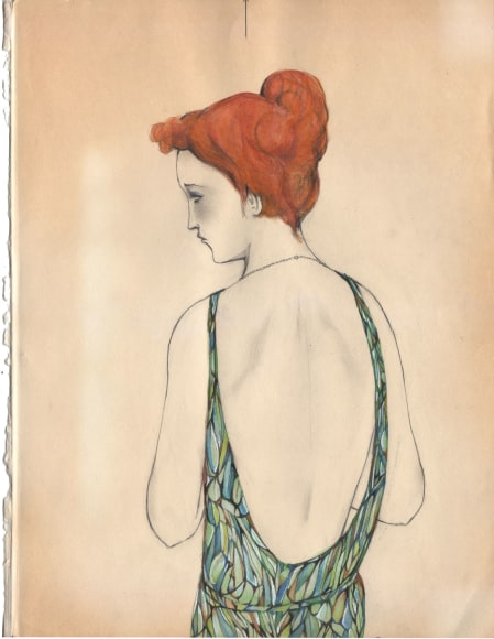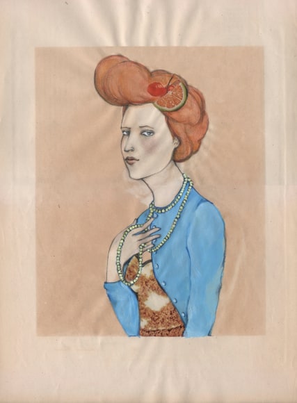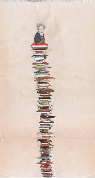 White engages the patina of aged papers from an old ruled composition book, a lost family recipe, a menu, or a musical score in a songbook from the past-each already invested with meaning and memory. Her sparse drawings are enhanced with a painterly touch and at times augmented with delicate details of cut paper and collage, such as a lace collar or butterfly wing. White's escapades are infused with a gentle and wry humor, and imply some hidden allegory. Her subjects are distinctive, melding classical elements of expression with a modern sensibility.
