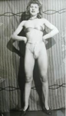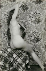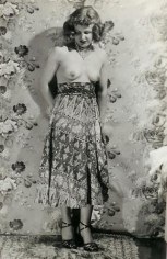 In 1939 Von Bruenchenhein met Eveline Kalke, "Marie," at a state fair in Wisconsin, and they were married in 1943. Marie was his muse, and they collaborated in staging hundreds of passionate and provocative, yet playful and loving, pinup-like photographs and slides of Marie. Costumed in drapery, bikinis, stockings and heavy heels, and adorned in swags of multiple pearl necklaces and homemade tin crowns, she posed seminude in front of chenille bedspreads and floral patterned backdrops. Von Bruenchenhein's resourcefulness played a central part in both the assembling and the effect: a luxurious setting fashioned from five-and-dime supplies. Their relationship found a sort of sideshow glamour in his carefully considered, and often erotic photographs. These intimate vignettes exemplify a subject/object dynamic, where Marie is immortalized while he occupied the part of voyeur. When seen together as a series, her response to his approach becomes a visual narrative. Acting as a model, and taking on the roles of goddess, queen, star, seductress and ingénue, she explores her own place in this work, often defining the look of an image through a glance or a smile.