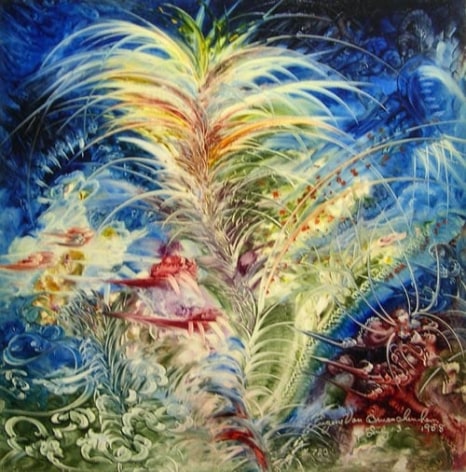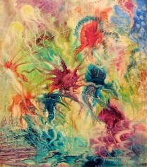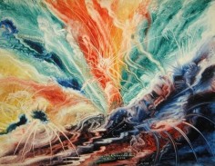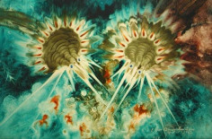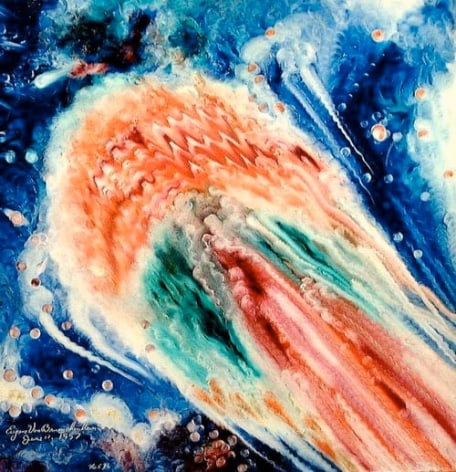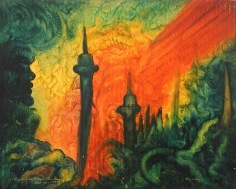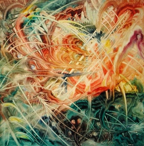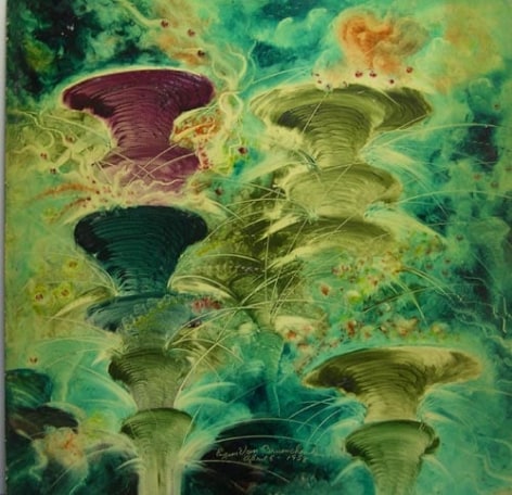 In 1954 Von Bruenchenhein began making intricate, brightly colored and spontaneously created surrealistic "finger paintings" of atomic mushrooms, radiating hearts, mythical sea creatures, serpent monsters, phantasmal landscapes, shooting comets and futuristic metropolises. He manipulated the paint with acute facility, using his fingers, sticks, straw, and brushes made from Marie's hair, to achieve amazing spatial effects. His paintings reflect the desire to see magnified that which can be both beautiful and horrific. These visions of mysterious life-forms, cosmic forces and dreamlike places were typically executed in one intuitive, possessed and intensely frenzied session. He, in fact, believed that his art was the result of "unknown forces at work…forces that have gone on since the beginning."