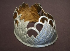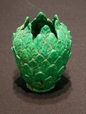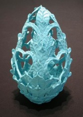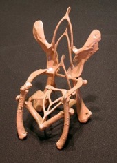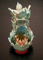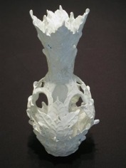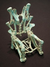 Von Bruenchenhein also made many organic vase-shaped ceramic sculptures and life-size crowns with flower, leaf and bud motifs. In the 1960s and 1970s he made sculptures of miniature chairs and thrones constructed out of dried chicken bones, as well as delicate architectural spires or towers of up to five feet high.