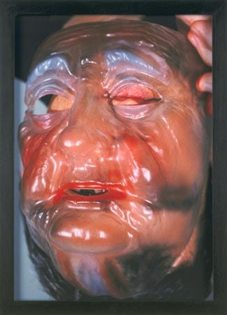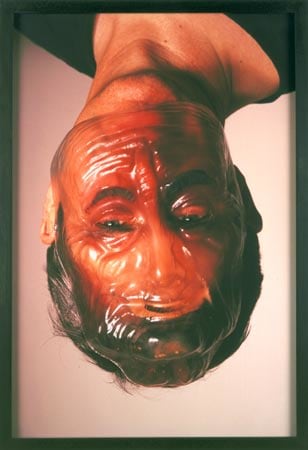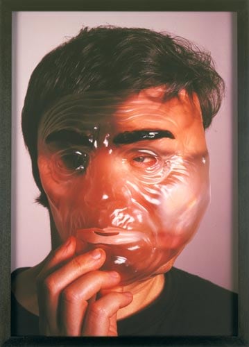 In another series of images Dunning uses the holes in transparent Halloween masks to separate and reconfigure parts of the face. Models wear clear masks upside down or sideways, and with our perception confused, we are disconcerted to find an eye peering through the opening of the mouth, or a stubbled chin where the eye should be. The see-through mask and the disguised or disfigured person behind it form an incomprehensible hybrid: the closer one looks, the less discernible the person becomes.