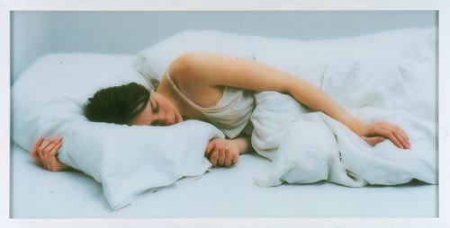 In two additional works, the scene is a bed covered in tossled white sheets. In one, only a single hand emerges from the sea of bedding, looking strangely bereft of the body it implies. In the other, a woman calmly sleeps with her arms and hands comfortably stretched across the covers around her; however, there are in fact three hands, all of which impossibly seem to be hers.
