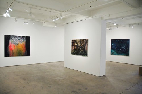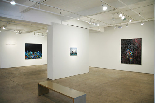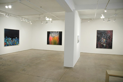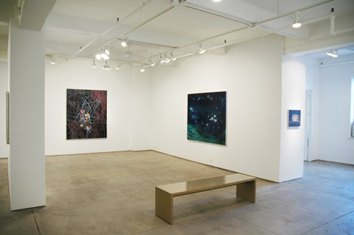 JENNIFER COATES' metaphysical paintings utilize the conventions of landscape as a vehicle for hallucinatory visions and psychological spaces. Expanses of sky or sea coalesce into reflective pools of paint; intricate geometric galaxies warp into ecstatic vortexes, and tiny specs of color form clusters of luminescent light. She contrasts atmospheric radiance with meticulous detail, and iconic directness with allusive abstraction. Varied painterly approaches are positioned against each other to create a disjunctive but idealistic experience of place.