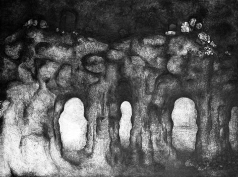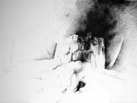 A series of dense black and white ink drawings delineate haunting woodlands and rocky passages that we want to cautiously and carefully explore. Coates' magical works echo the immenseness and mystery of the stars at night, the smallest natural wonders around us, and her own inner cosmologies. With a sense of awe, and somehow connected to the crevices of our minds, we wish to follow the alluring pathways of her imagination.