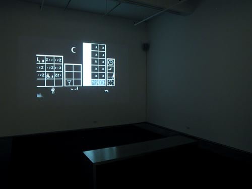 Arrhenius often uses pictographs, the kind of stereotypical figures and universal symbols seen on public information signs. A direct use of media, and a judicious blend of austerity and irony are typical of his work. The digital characters in his animation, The Street, create an exaggerated view of daily routines, where each individual contributes to keep things going like an anonymous cog in the machine of life. Arrhenius' hermetic but familiar world is propelled by a momentum of the mundane that insistently plods onward. In another work entitled Habitat, in which a five-floor house is represented by the stacked rows of 43 C-prints, we view a sequence in the lives of 10 people breaking down the archetypes and representing the possibility of personal choice and eccentricity.