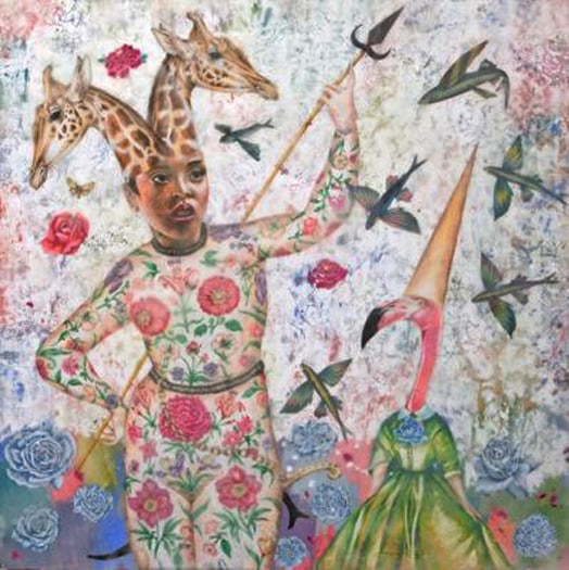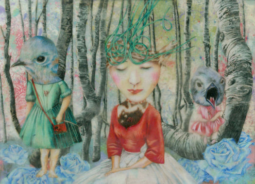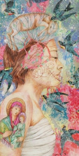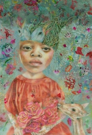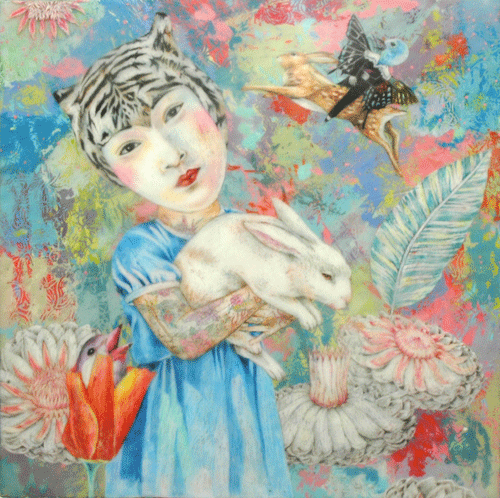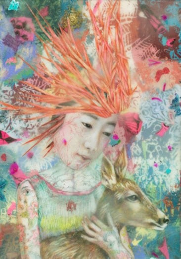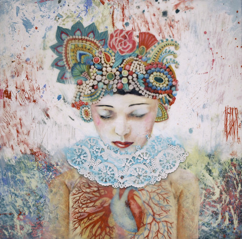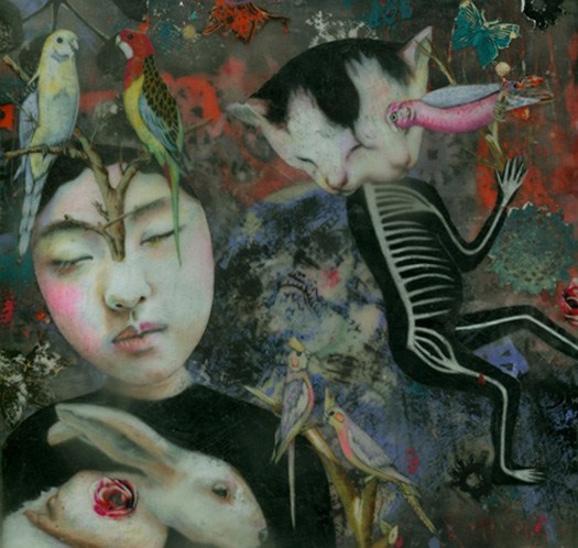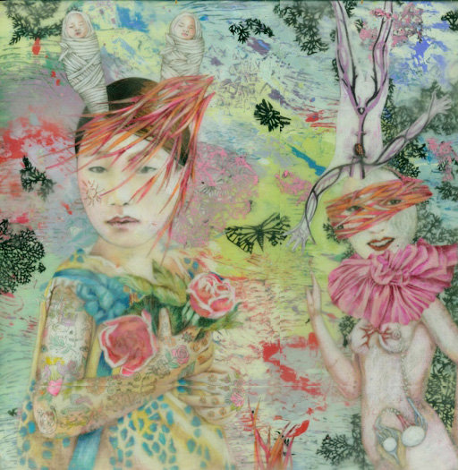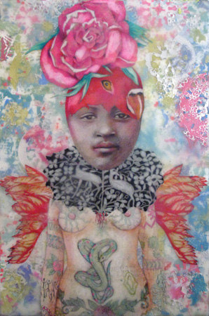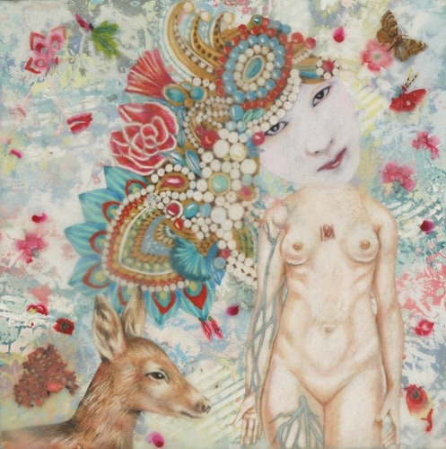 LORI FIELD's encaustic paintings with collaged drawings portray hallucinatory visions derived from her flirtation with demonic realms, personal fairy tales, and the human world. The chimerical creatures that populate Field's mixed media works are at once familiar and mysterious. They are the realization of modern day myths that draw on a primitive lore. Her fanciful visual and cultural vocabulary is embellished with elements such as thread, lace, and insect wings - a mélange that inspires discovery and wonderment.