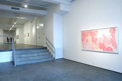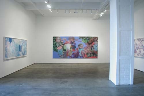 Nicky Hoberman is well known for her paintings of large-faced figures placed against flat backgrounds in shallow spaces. Her subjects often appear fixed in internally focused psychologies, separated from each other and us in their own isolated worlds. In her current exhibition, Hoberman explores more complex pictorial structures in large drawings and one 12-foot oil painting. The results are fantastical scenes of little girls and cats floating amid scattered foliage and tumbling over each other without regard for perspective or gravity. Each child's knowing expression is captivating, yet the figures are clearly dissociated from each other no matter how closely they may be situated. Hoberman's distorted, dream-like environments transform snapshot memories into not-so-innocent panoramas of a contemporary Alice in Wonderland reality.