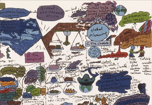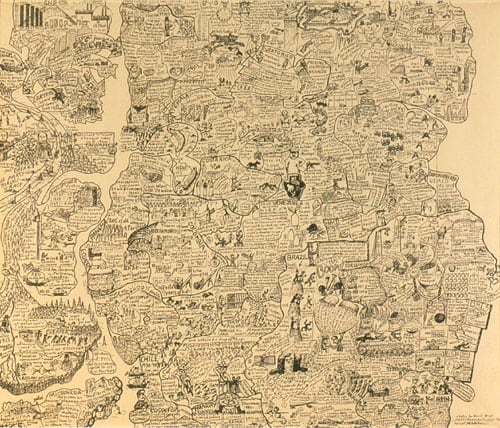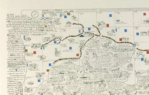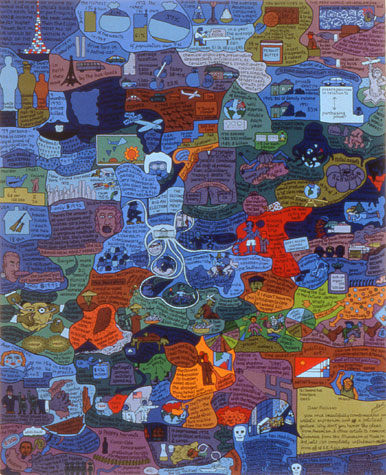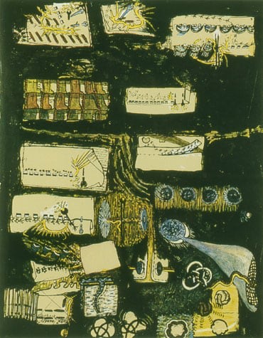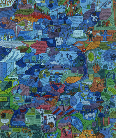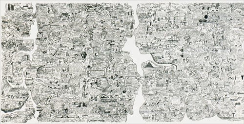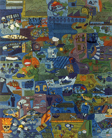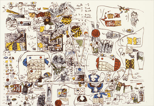 Following his idealistic vision of making art that was more accessible, Fahlström dedicated himself to the populist practice of making multiples and graphic works. Cartographic and diagrammatic, these politically oriented works read like rebuses, merging dense information with obsessive cartoon-like imagery and formal pictorial invention. Employing systems and strategies found in maps, puzzles and games, Fahlström created his own visual language that critiqued globalism and promoted utopian ideas. He highlighted current events and investigated political, social and economic concerns in visually complex works of art.