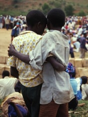 ALFREDO JAAR's Rwanda Project: 1994-2000 is a series of twenty-one photography-based installation works including "The Eyes of Gutete Emirita," "Real Pictures" and "Embrace" derived from his experiences in Rwanda. He first travelled there in the summer of 1994 while the genocide was still ongoing and overwhelmingly ignored by the international community. The Rwanda Project attempts to counter and transform the conventions of photojournalism, which frequently objectifies violence through unmediated images of victimization. Alternatively, Jaar reverses the lens' eye to focus on the eyes of the witnesses and the hauntingly beautiful landscape in which this massacre was enacted as a means of eliciting an emotional response from the viewer in which every individual feels responsible for the community and for 'the other.'