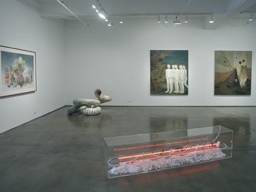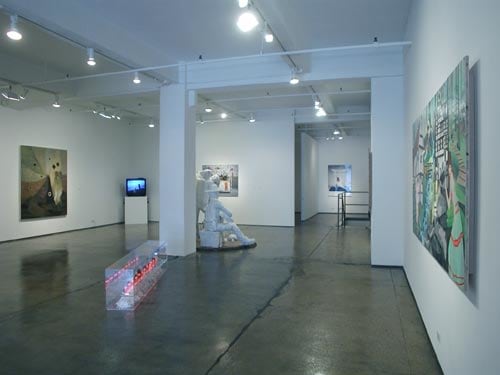 But even Huey's Gothic Valkyries in flowing gowns (and knee-high socks with Manolo sling-backs) may not be enough to protect you from the snake in the grass, a shape-shifting serpent offering up a confusing smorgasbord of identity options. Mod, Punk, Preppie, illmatic Bling-King, or camo-clad embedded human sacrifice--the choice, albeit niche-marketed and product driven--is yours. But why buy the snake oil, Ben Beaudoin seems to ask, when you can have the snake itself? Beaudoin has literalized the menu of identity options by "texture-mapping" them, if you will, onto a curling, slithering abstract form. His interest? Identity blending--wallflowers, the Organization Man, the woman in the crowd, human infantry--and identity as it desperately distinguishes itself from the mainstream: replicant suicide girls doing some soul searching while searching for an actual soul, Indie-Pop nano-bots changing their footwear before the last keyboard blip and cymbal crash signals the end of the party.
