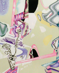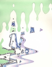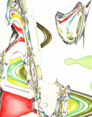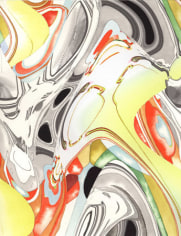 The term "mixed media" as applied to the works in these two exhibitions must be clarified, as it may no longer represent what it once did. In the case of Ms. Kaneda's recent watercolors, they are actually a type of montage, or what might be considered a collage of processes and media, in that these works not only originate in the computer, but also include passages which are digitally printed on to the watercolor paper and, as such, play heavily on the idea that one can cut and paste a computer image. Both in working with the computer to configure her non-objective images and in choosing to include printed imagery, Kaneda investigates the relationships between the "photographic" and the painted or between the unique and the reproducible, as well as how new technologies might be employed to supplement traditional form.