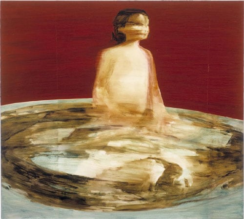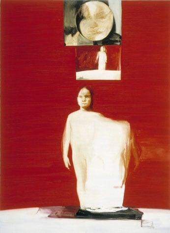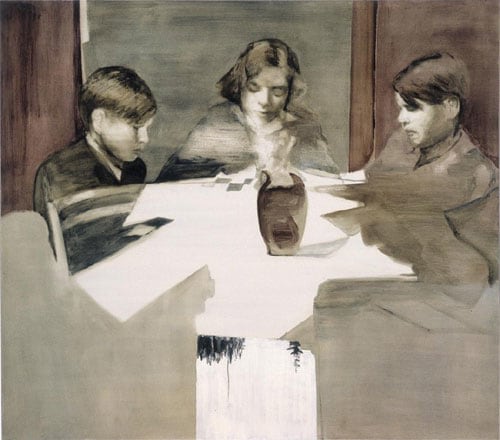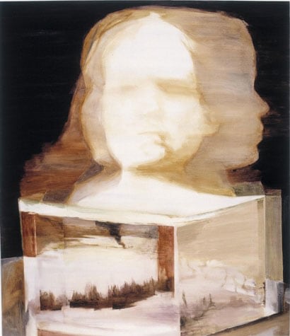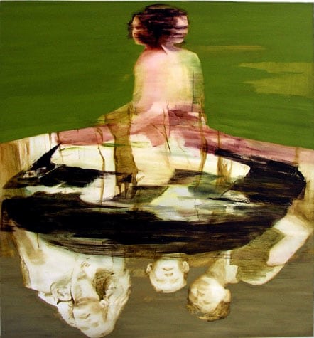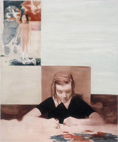 Swedish artist Susanne Simonson's psychological portraits register like memories or dream-like longings that hover and disappear into ghostly blurs and soft color fields. Photo-derived images seem to turn away from the viewer in elusive stuttered phases, smeared into the past tense and the realm of quiet contemplation through lyrical, sweeping paint strokes. The moodiness and introspection of the figurative subjects is enhanced by the washes of color that surround them. Simonson's composed and reductive paintings emphasize the fleeting, apparitional quality of thought and experience.