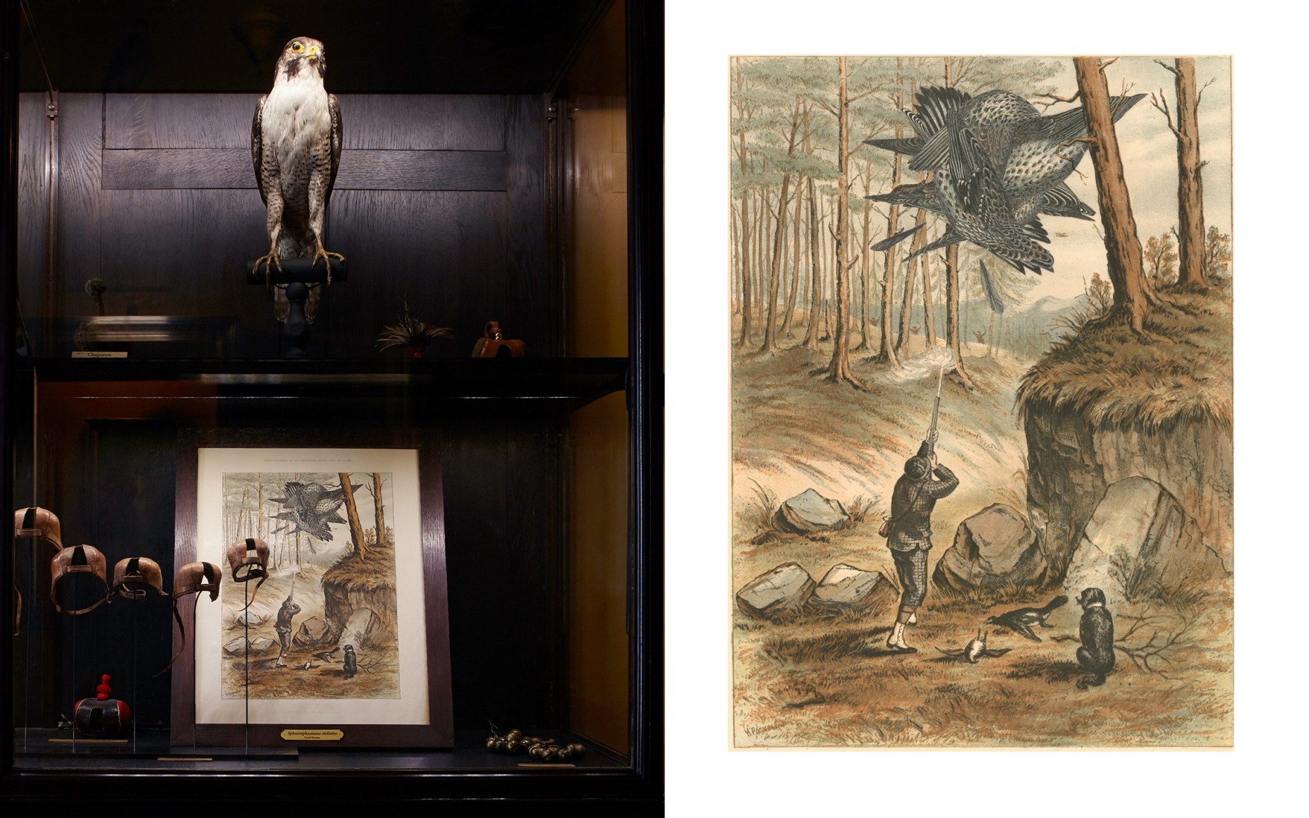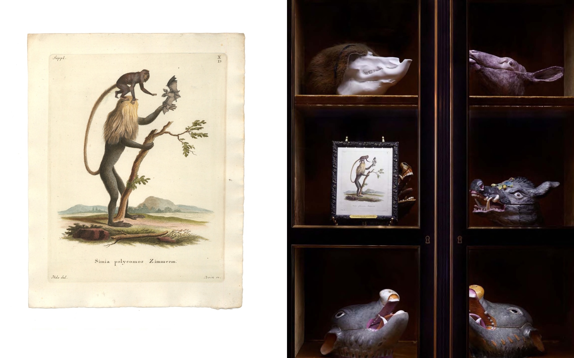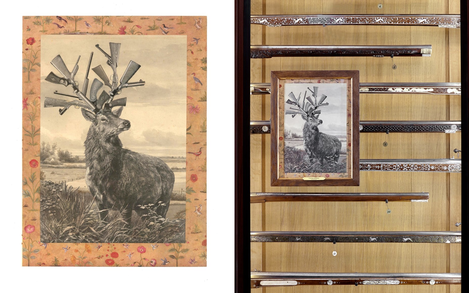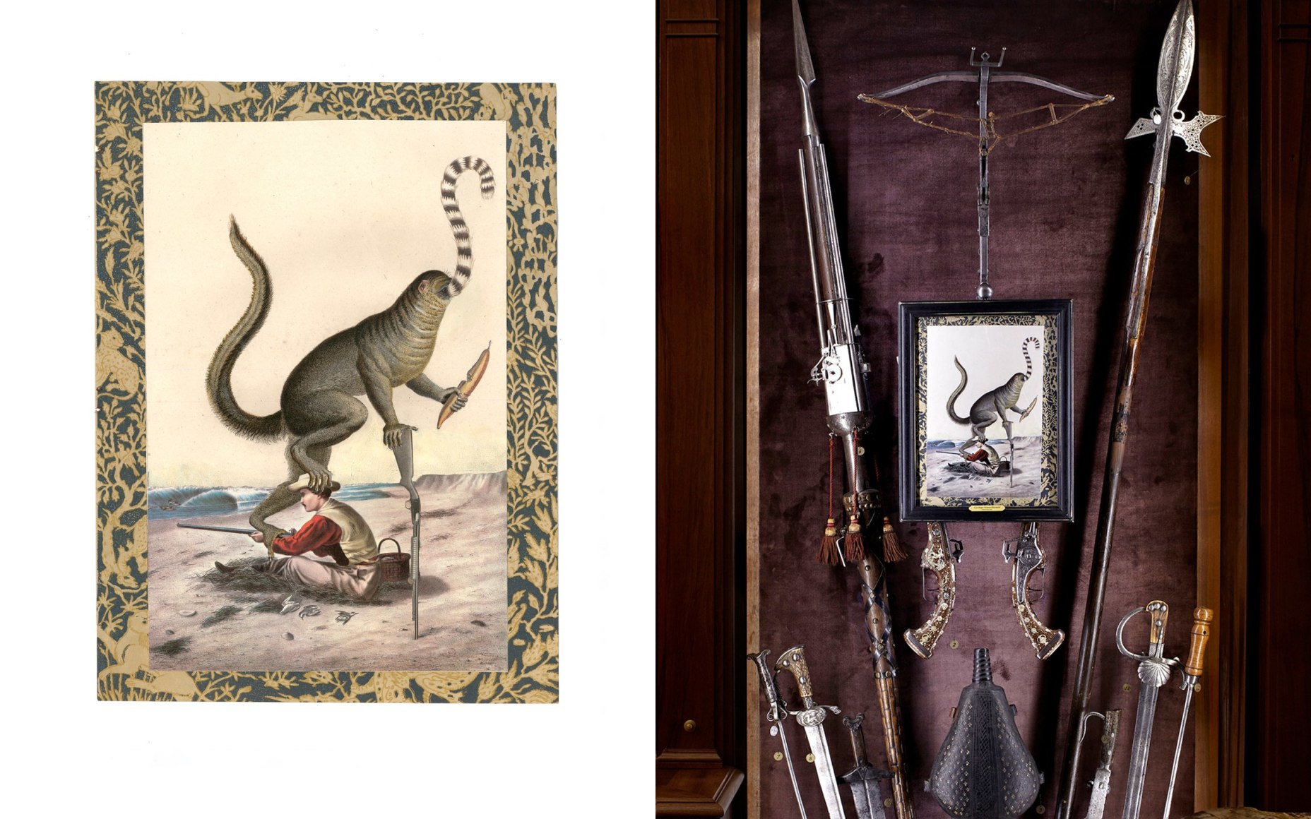 Recently I was commissioned by Claude d’Anthenaise and the Musée de la Chasse et de la Nature to produce a body of 20 works combining realism and surrealist abstraction in an exploration of pseudo-historical documentation. Retelling a fictive safari expedition, I manipulated 18th and 19th century engravings to explore the art of hunting, as a metaphor for man’s quest of self. The objective is to successfully manipulate the image by harnessing the given style and technique of the antique engravings and watercolors, and confuse the viewer as to what is authentic and what is intervention. By seamlessly integrating the counterfeit historical work back into the permanent collection of the museum’s many exhibition rooms among many other genuine historic arifacts, the exhibition confuses what is “museological objectivation” and “ontological engineering” to cite the philosopher, Vincent Normand.
