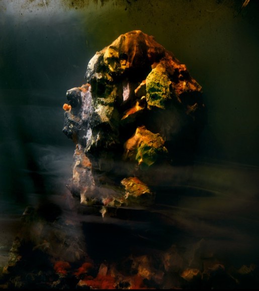 He is also well-known for his large-scale landscape photographs, which are created by meticulously constructing miniature topographies in the empty tank, which is then filled with water. These dioramas of fictitious environments are next brought to life with colored light filters and the dispersal of pigment, producing ephemeral atmospheres that he must quickly capture with his large-format camera.