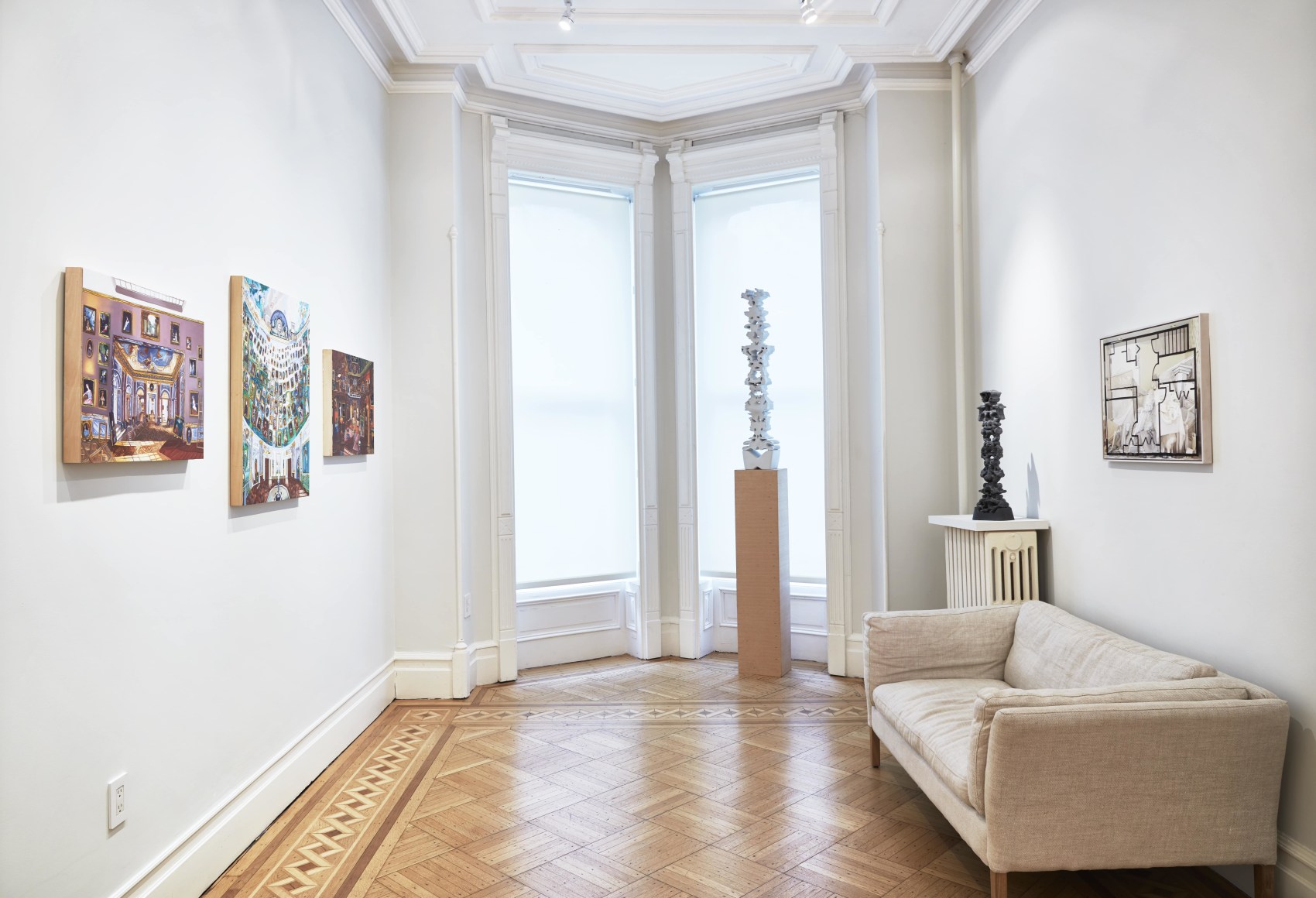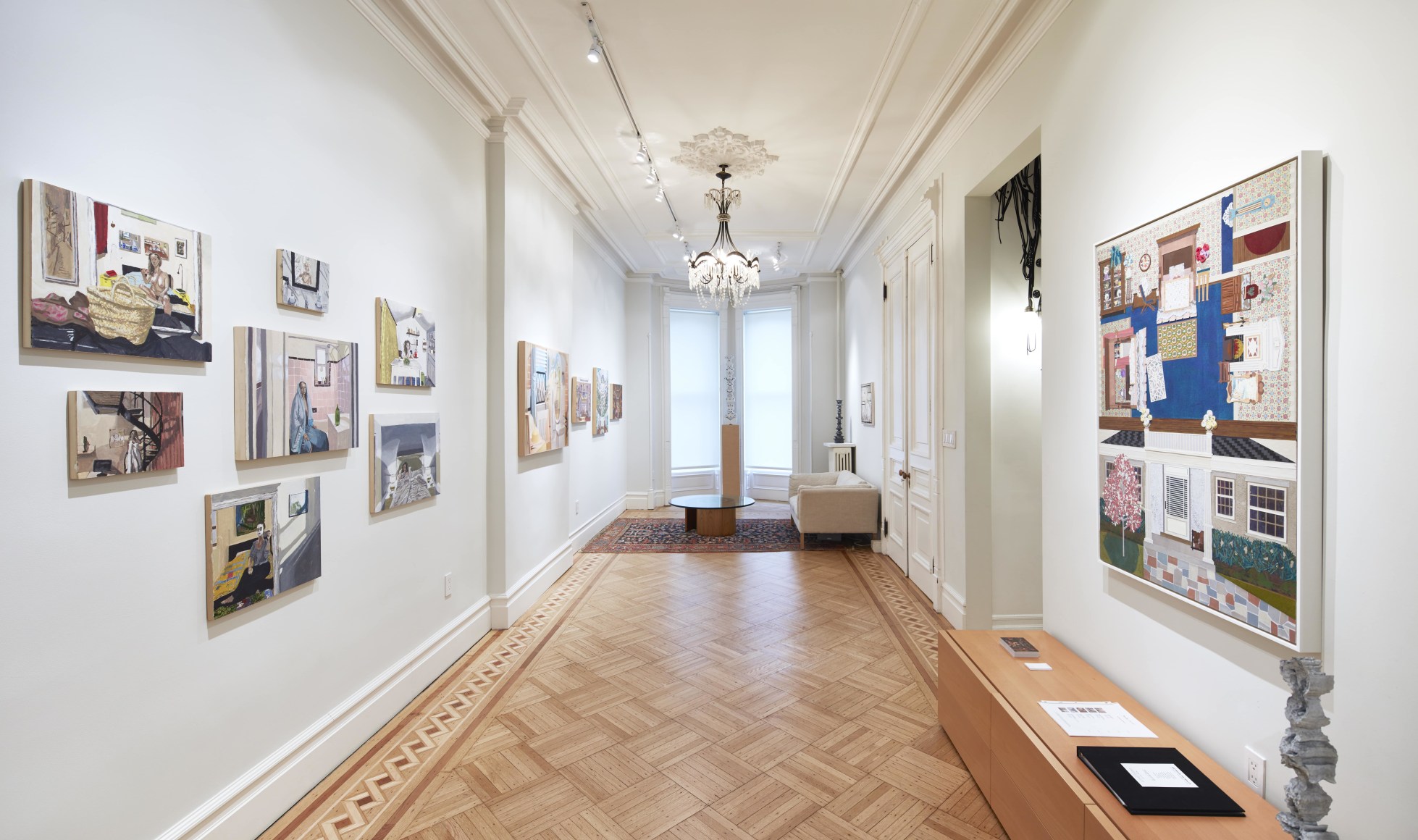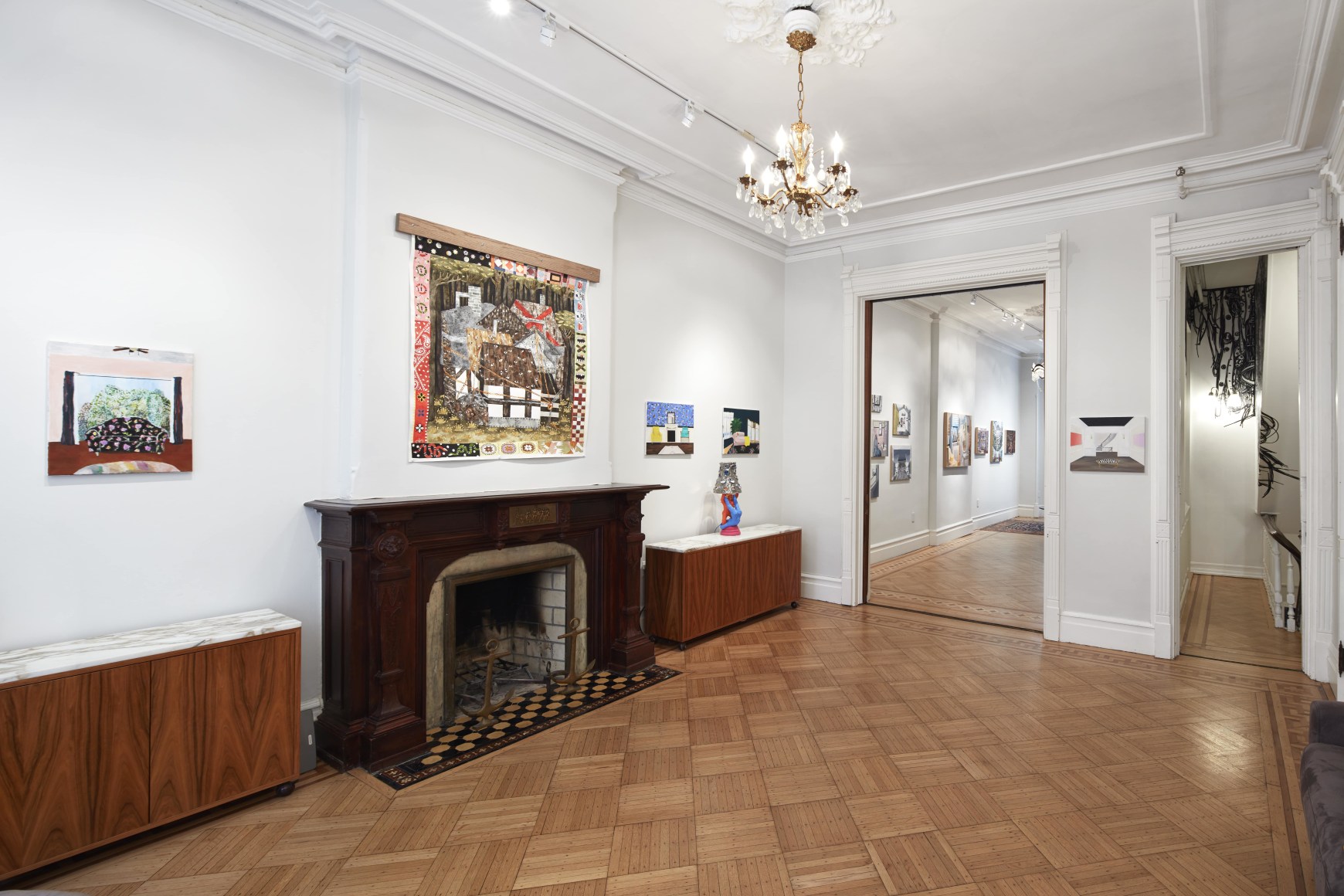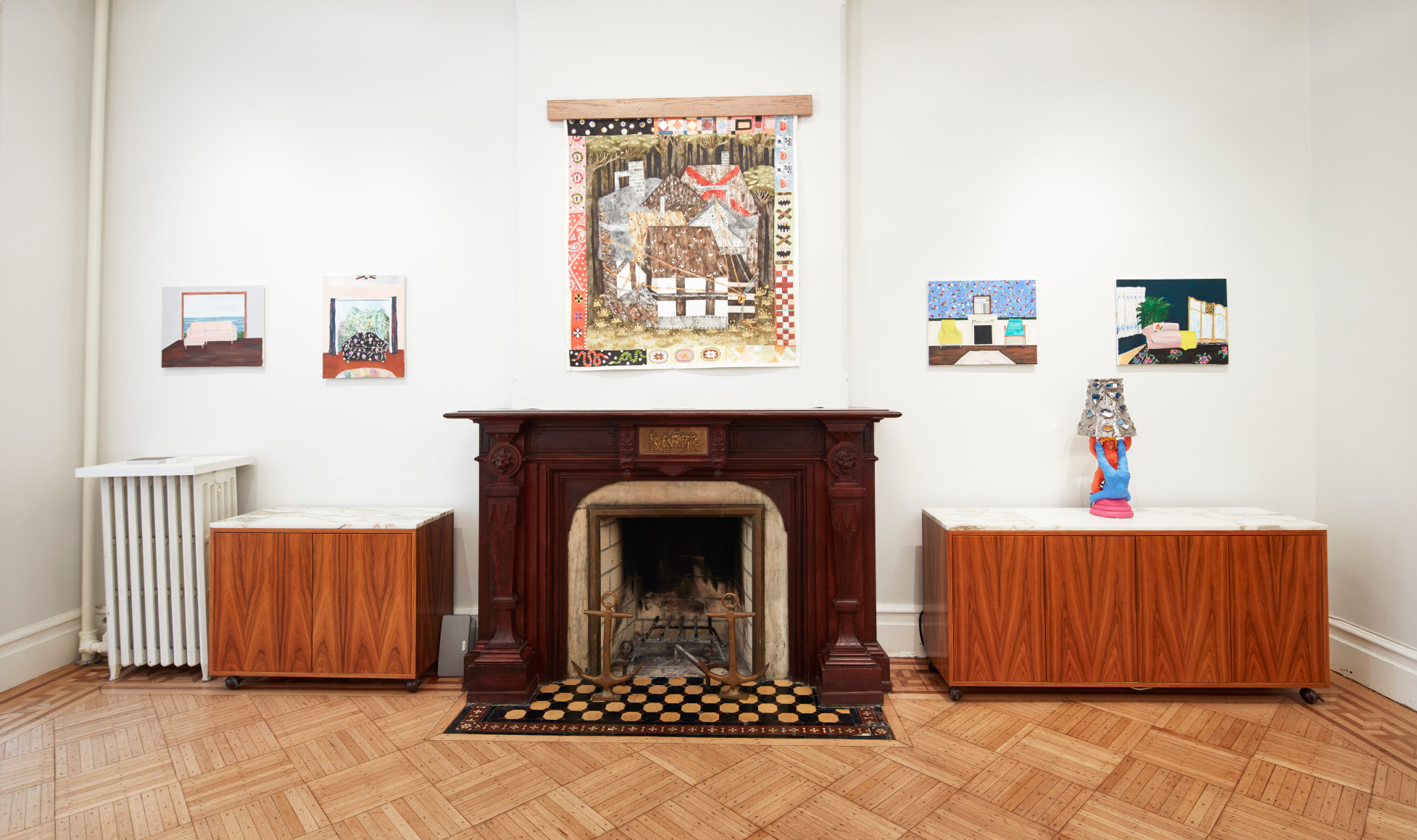 Gretchen Scherer’s paintings of gilded mansions, hallways and staircases expand and contract like a dream. Drawing directly from vintage antique and home décor magazines, Scherer creates her own interiors- part fantasy and part reality. For Ann Toebbe, home spaces and their decorative layouts are clues to a larger story. Her spaces are viewed from above like an architect’s blueprint, yet through nuance and decoration each painting reveals stories about their inhabitants. Similarly, artist Polly Shindler crafts paintings of overstuffed sofas, favorite chairs and bedroom nooks. Her work speaks to the necessity and pleasure of crafting our home spaces as well as the personality these objects bring to the way we live. Working in ceramics, Katie Stout’s practice is shaped by an urge to subvert commonplace household objects such as lamps, rugs and mirrors. Her voluptuous figurative ceramic lamps combine dark irony with playful celebration.