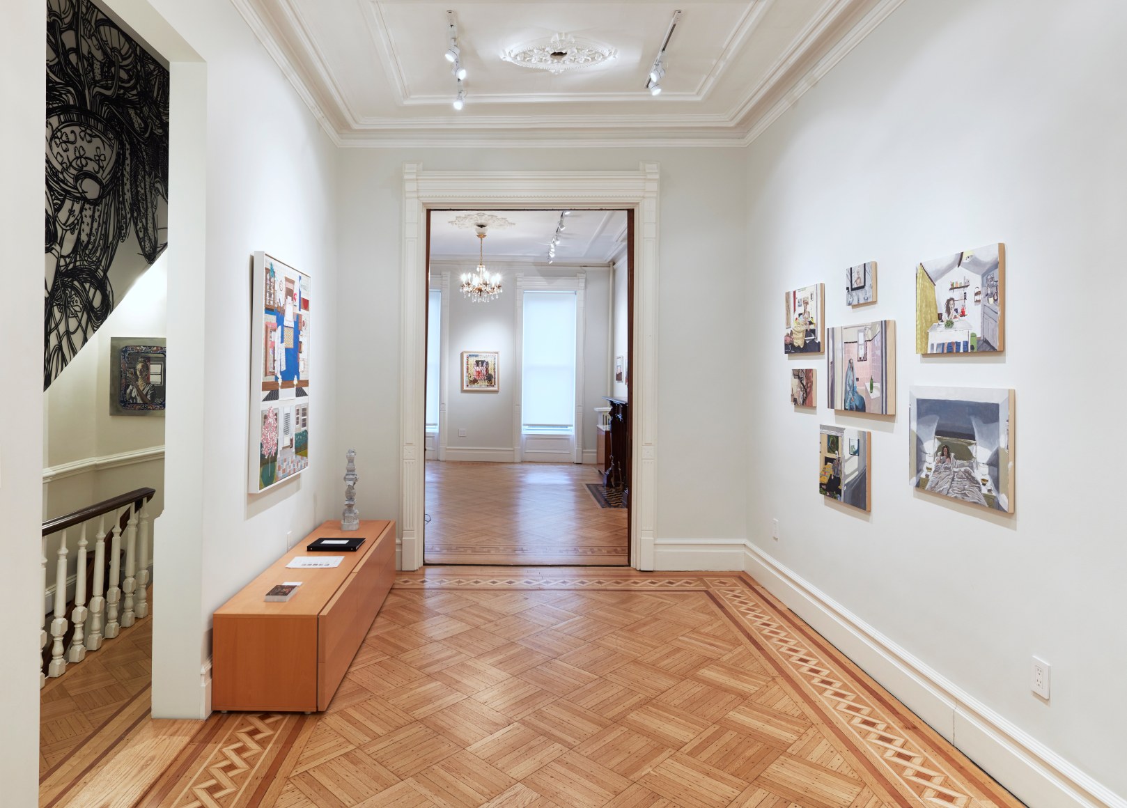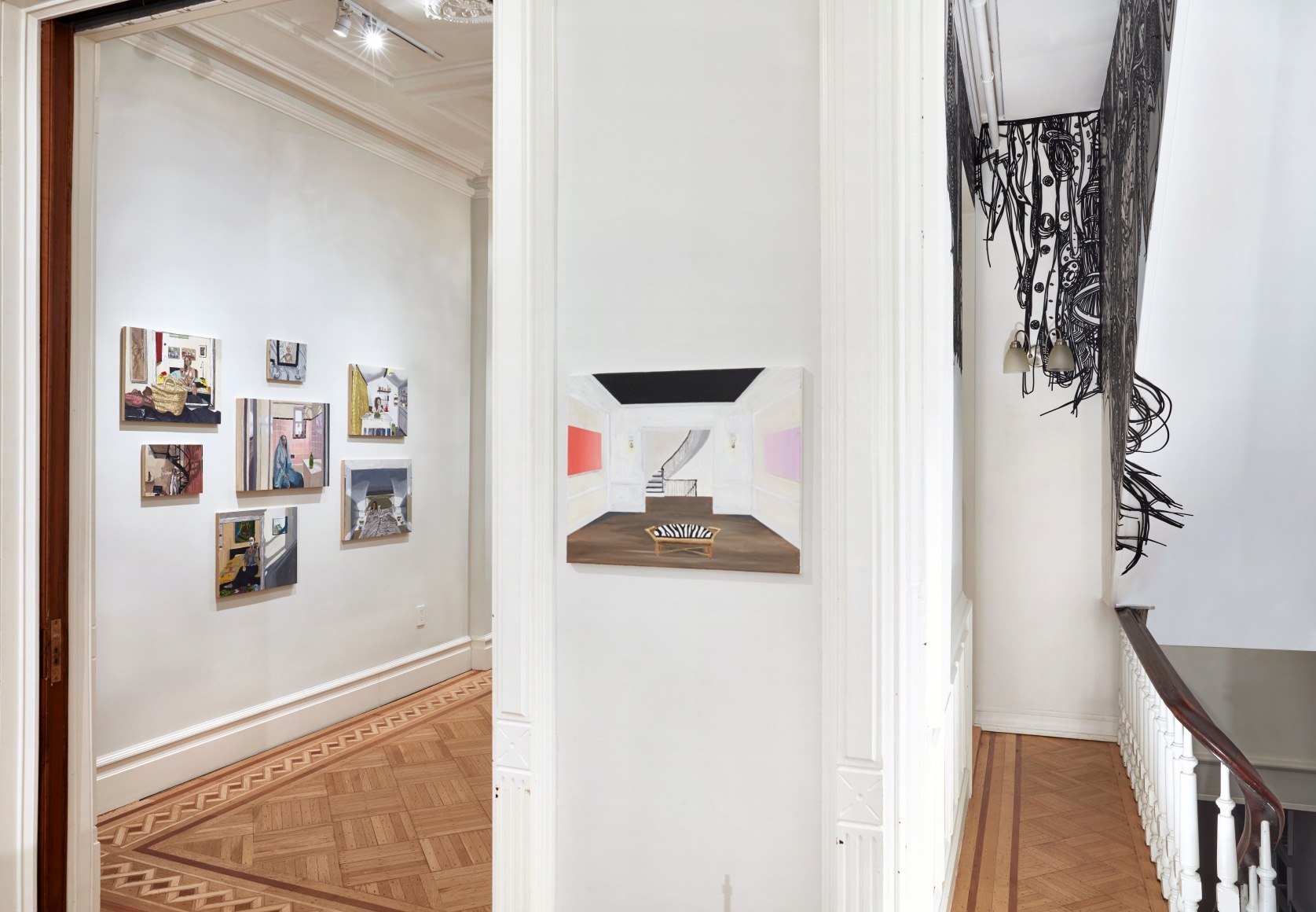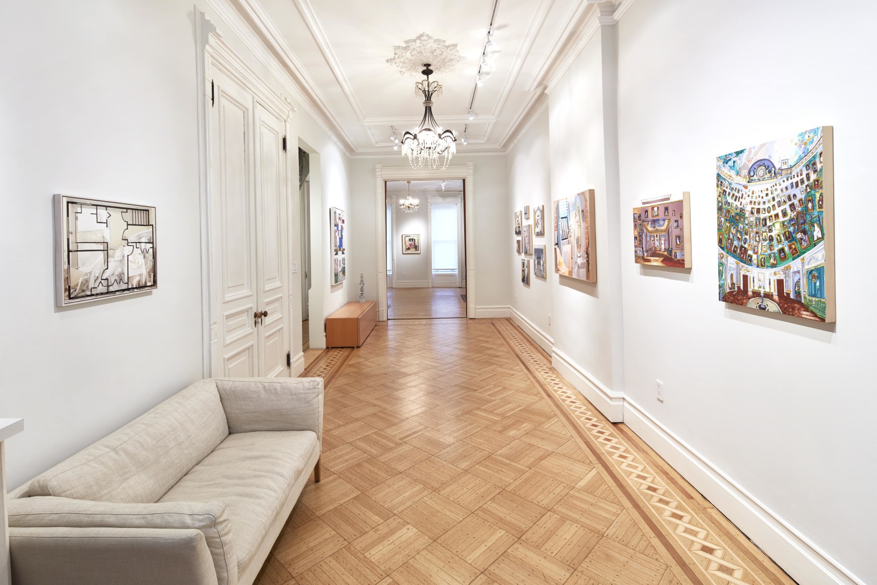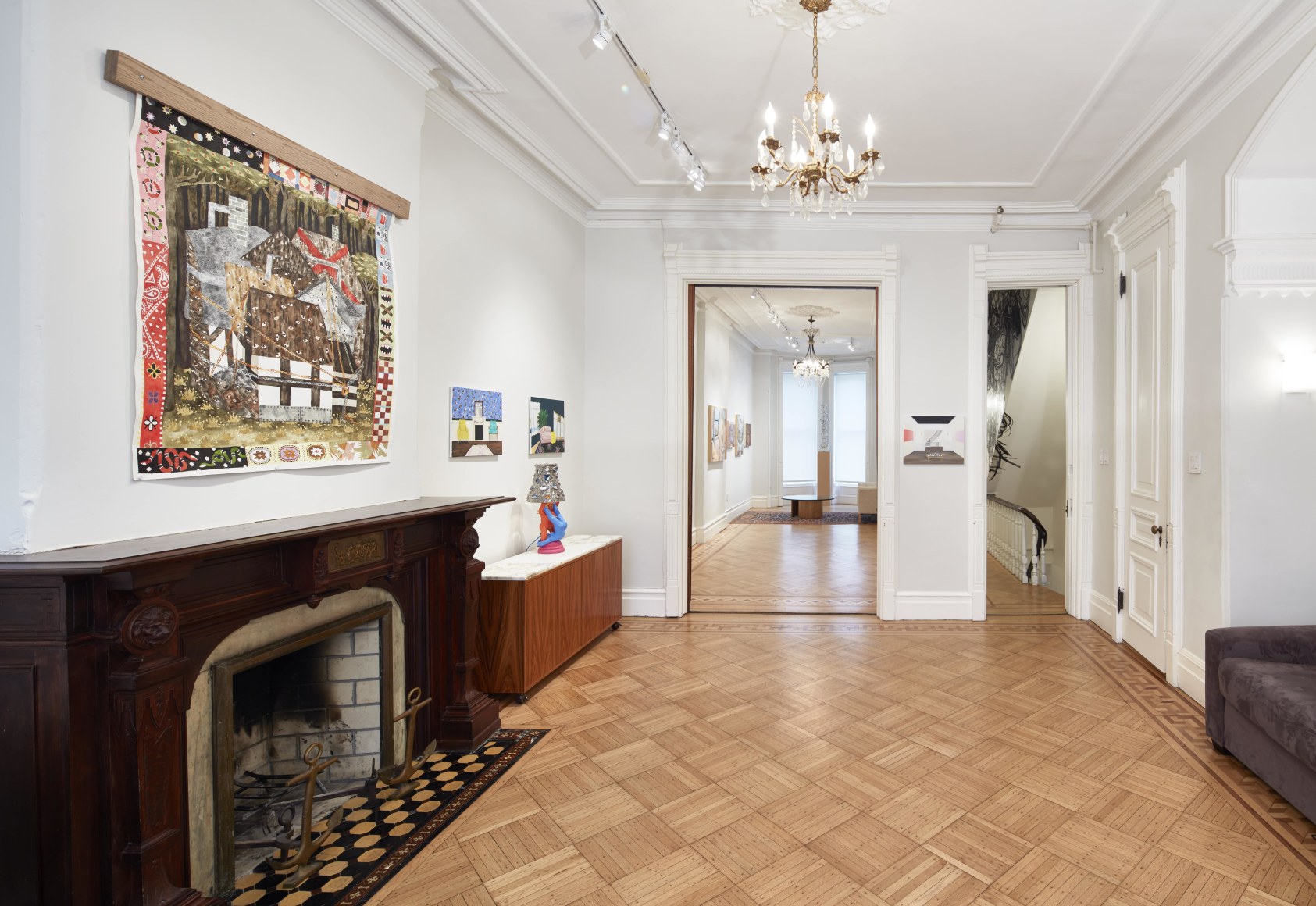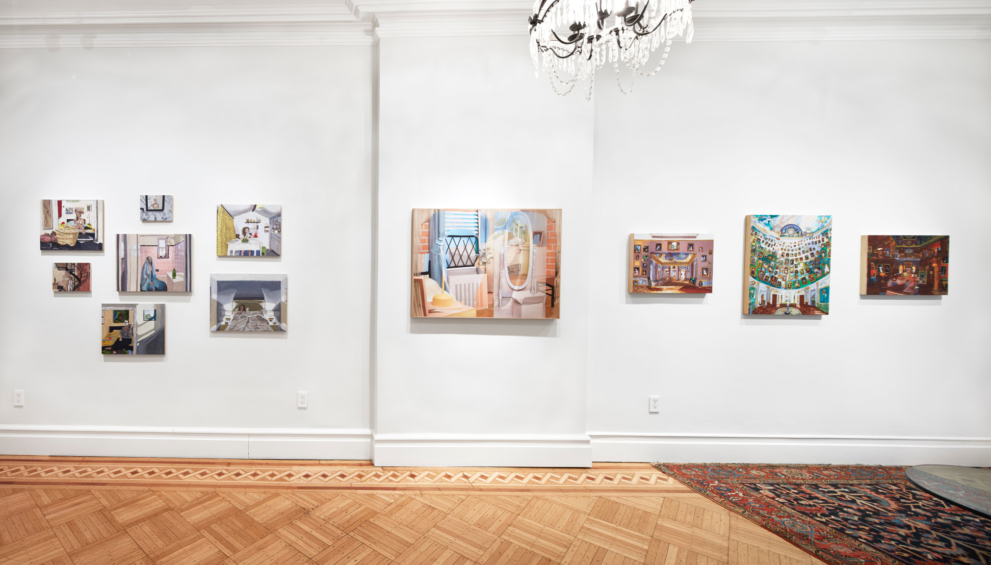 Gretchen Scherer’s paintings of gilded mansions, hallways and staircases expand and contract like a dream. Drawing directly from vintage antique and home décor magazines, Scherer creates her own interiors- part fantasy and part reality. For Ann Toebbe, home spaces and their decorative layouts are clues to a larger story. Her spaces are viewed from above like an architect’s blueprint, yet through nuance and decoration each painting reveals stories about their inhabitants. Similarly, artist Polly Shindler crafts paintings of overstuffed sofas, favorite chairs and bedroom nooks. Her work speaks to the necessity and pleasure of crafting our home spaces as well as the personality these objects bring to the way we live. Working in ceramics, Katie Stout’s practice is shaped by an urge to subvert commonplace household objects such as lamps, rugs and mirrors. Her voluptuous figurative ceramic lamps combine dark irony with playful celebration.