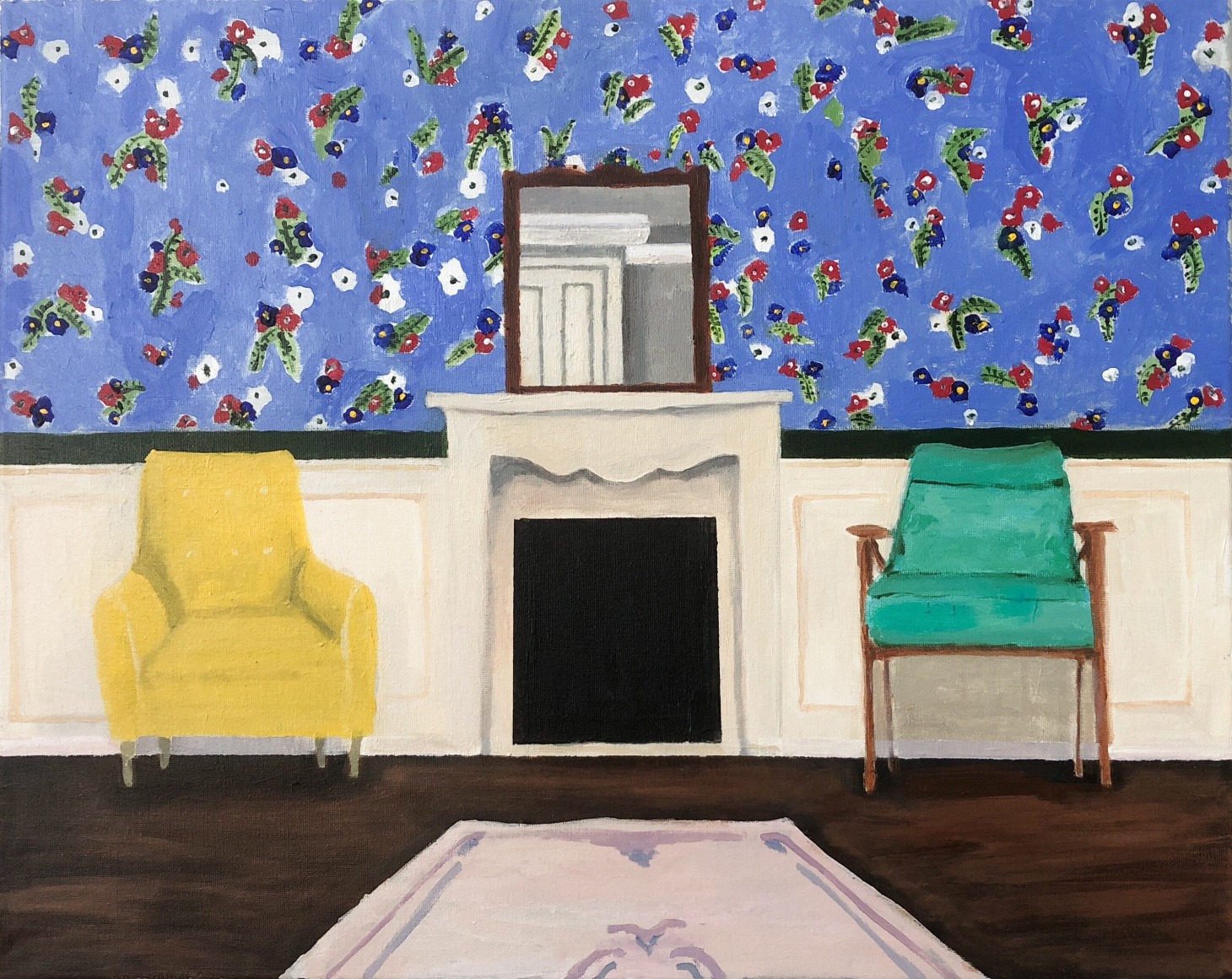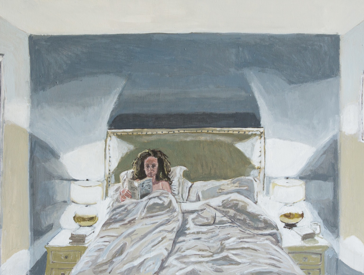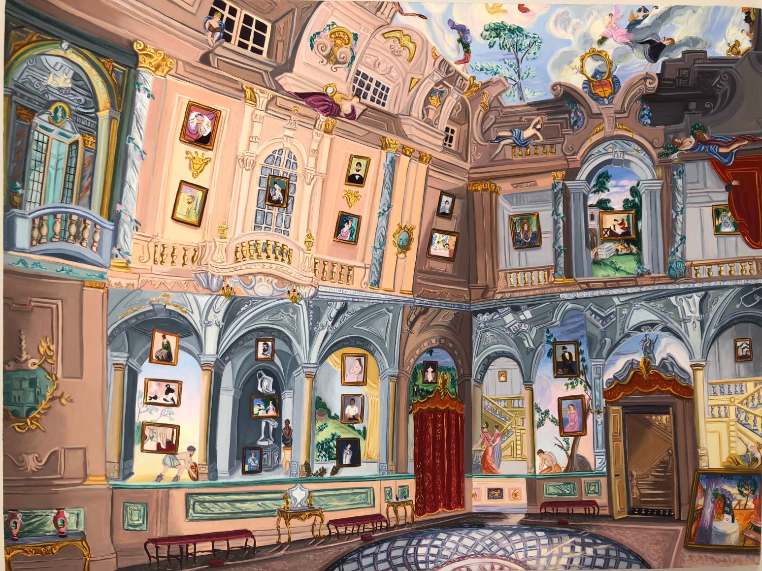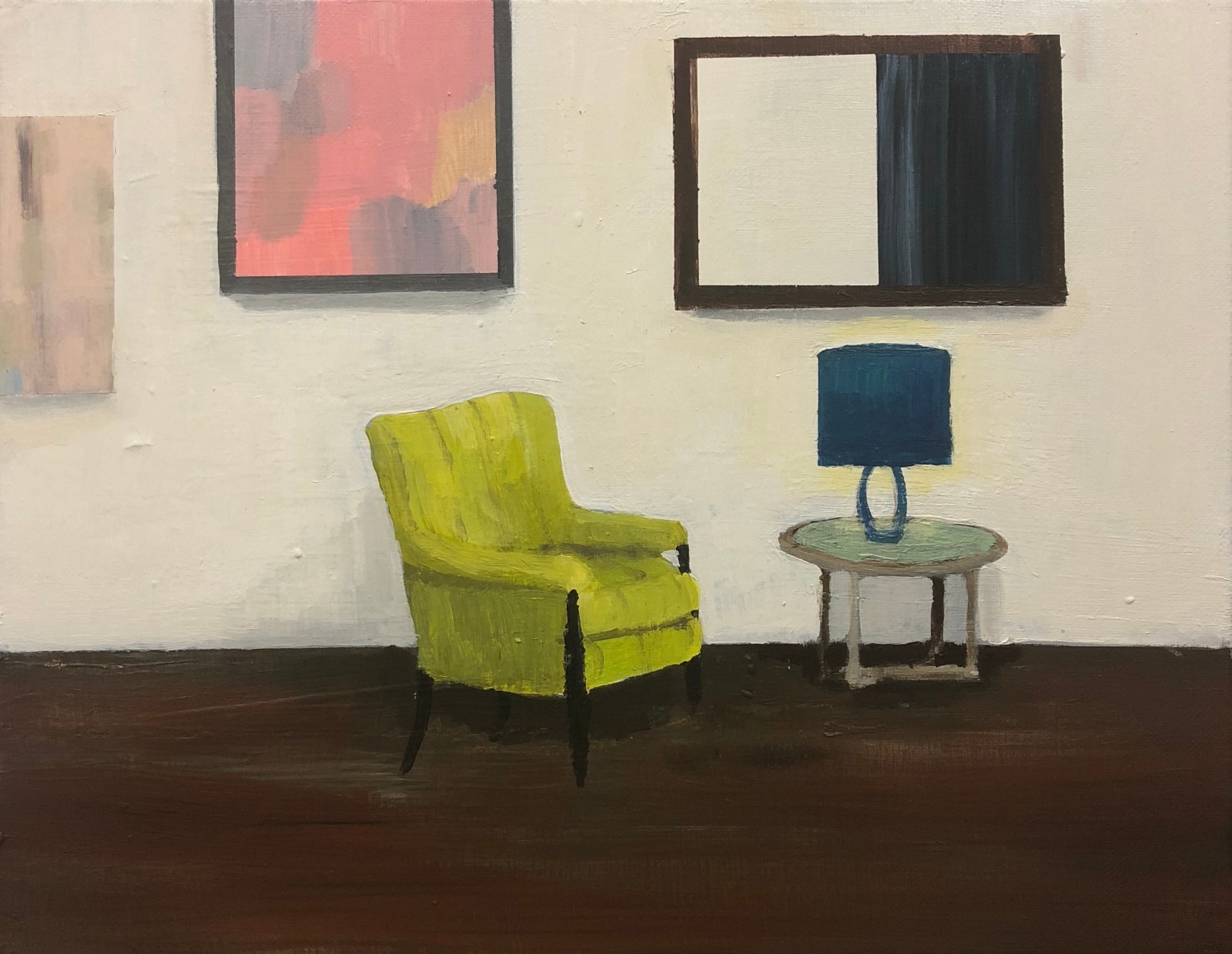 Gretchen Scherer’s paintings of gilded mansions, hallways and staircases expand and contract like a dream. Drawing directly from vintage antique and home décor magazines, Scherer creates her own interiors- part fantasy and part reality. For Ann Toebbe, home spaces and their decorative layouts are clues to a larger story. Her spaces are viewed from above like an architect’s blueprint, yet through nuance and decoration each painting reveals stories about their inhabitants. Similarly, artist Polly Shindler crafts paintings of overstuffed sofas, favorite chairs and bedroom nooks. Her work speaks to the necessity and pleasure of crafting our home spaces as well as the personality these objects bring to the way we live. Working in ceramics, Katie Stout’s practice is shaped by an urge to subvert commonplace household objects such as lamps, rugs and mirrors. Her voluptuous figurative ceramic lamps combine dark irony with playful celebration.