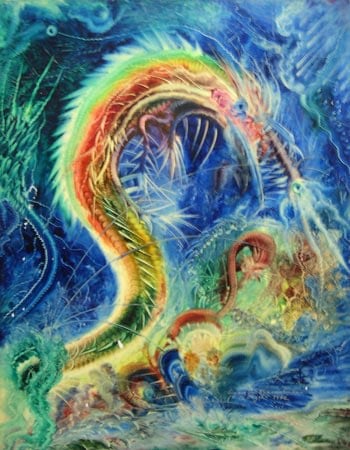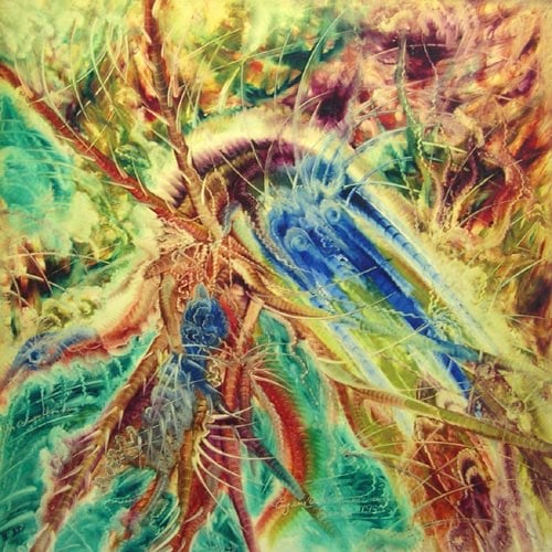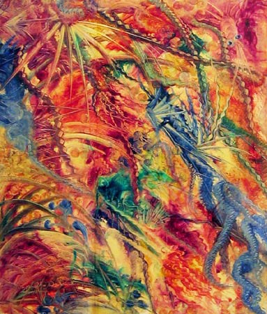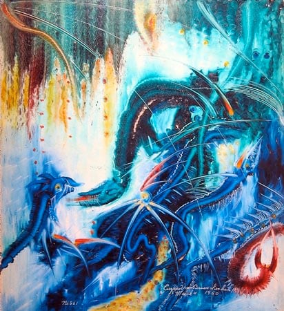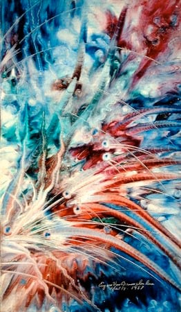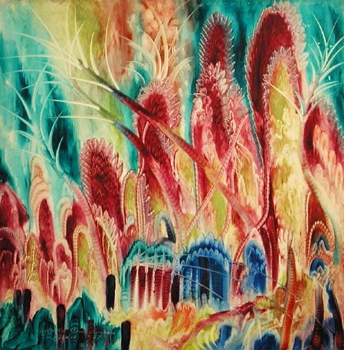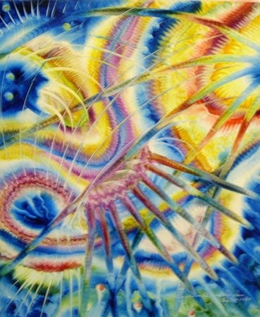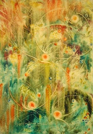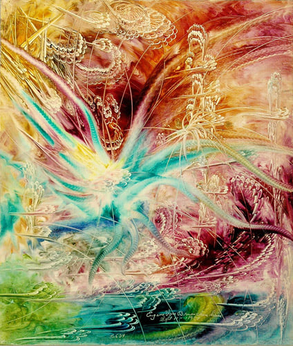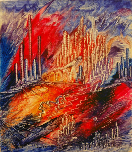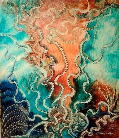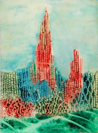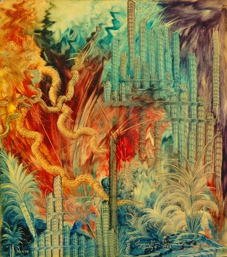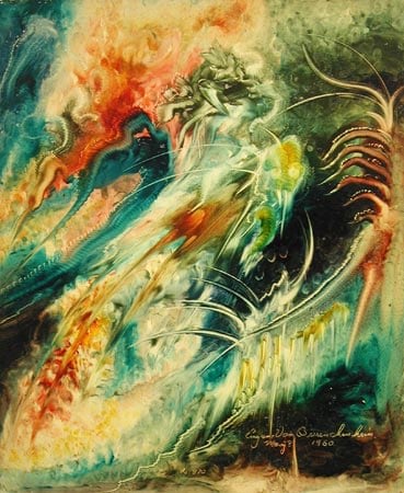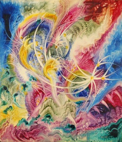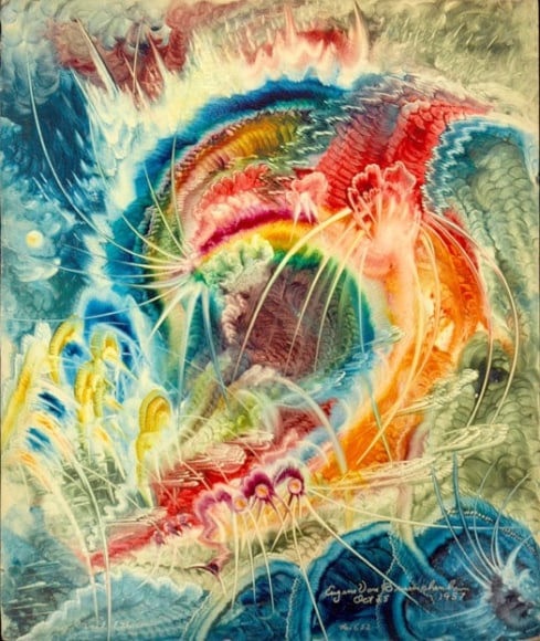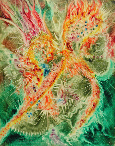 In 1954 Von Bruenchenhein began making intricate, brightly colored and spontaneously created surrealistic "finger paintings" of atomic mushrooms, radiating hearts, mythical sea creatures, serpent monsters, phantasmal landscapes, shooting comets and futuristic metropolises. He manipulated the paint with acute facility, using his fingers, sticks, straw, and brushes made from Marie's hair, to achieve amazing spatial effects. His paintings reflect the desire to see magnified that which can be both beautiful and horrific. These visions of mysterious life-forms, cosmic forces and dreamlike places were typically executed in one intuitive, possessed and intensely frenzied session. He, in fact, believed that his art was the result of "unknown forces at work…forces that have gone on since the beginning."
