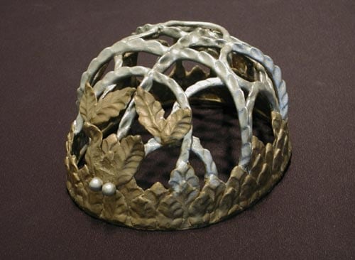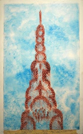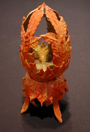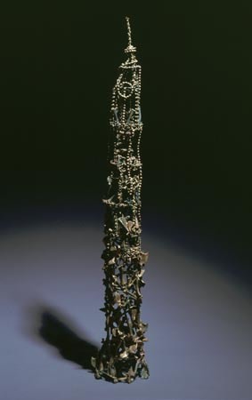 Von Bruenchenhein also made many organic vase-shaped ceramic sculptures and life-size crowns with flower, leaf and bud motifs. In the 1960s and 1970s he made sculptures of miniature chairs and thrones constructed out of dried chicken bones, as well as delicate architectural spires or towers of up to five feet high.