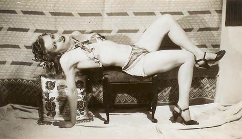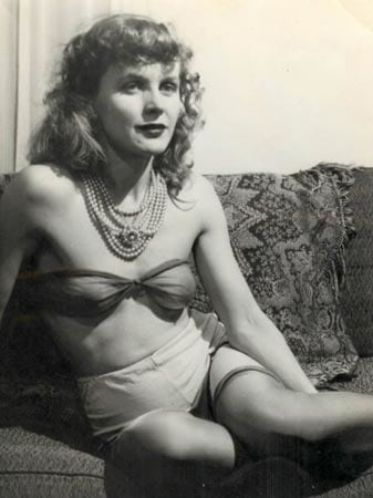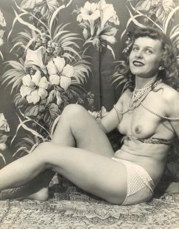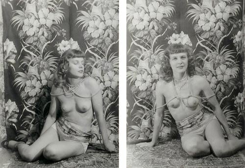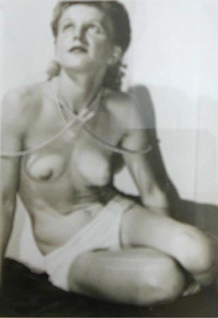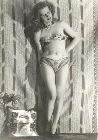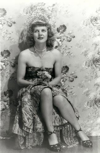In 1939 Von Bruenchenhein met Eveline Kalke, "Marie," at a state fair in Wisconsin, and they were married in 1943. Marie was his muse, and they collaborated in staging hundreds of passionate and provocative, yet playful and loving, pinup-like photographs and slides of Marie. Costumed in drapery, bikinis, stockings and heavy heels, and adorned in swags of multiple pearl necklaces and homemade tin crowns, she posed seminude in front of chenille bedspreads and floral patterned backdrops. Von Bruenchenhein's resourcefulness played a central part in both the assembling and the effect: a luxurious setting fashioned from five-and-dime supplies. Their relationship found a sort of sideshow glamour in his carefully considered, and often erotic photographs. These intimate vignettes exemplify a subject/object dynamic, where Marie is immortalized while he occupied the part of voyeur. When seen together as a series, her response to his approach becomes a visual narrative. Acting as a model, and taking on the roles of goddess, queen, star, seductress and ingénue, she explores her own place in this work, often defining the look of an image through a glance or a smile.