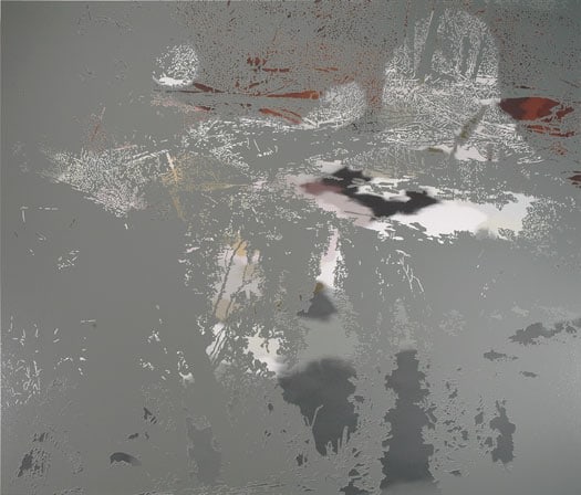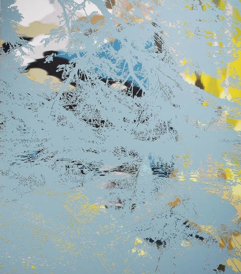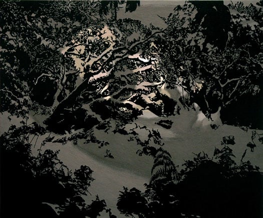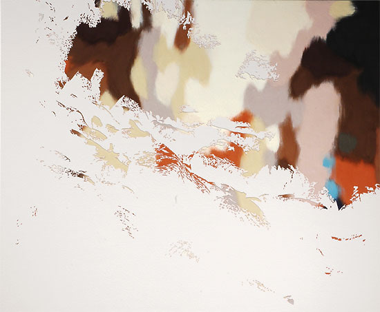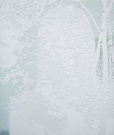 Graham Parks' poetic paintings of abstracted landscapes begin with photographs of places he knows. His carefully considered compositions are simplified to overlapping silhouettes of precise delicate details. Masking off areas and layers with tape, Parks meticulously cuts out the intricate shapes of tree branches with filters of light, creek-side reflections, wooded snow-scapes and sea-side boulders, giving each of these elements their own crisply defined identity. In contrast, he then overlays blends of soft color to his mostly monochromatic pictures with indecipherable ghost shadows of faces and figures based on found magazine images. Parks' reductive paintings are at once simple and soft-spoken, yet complex with much to voice and discover.