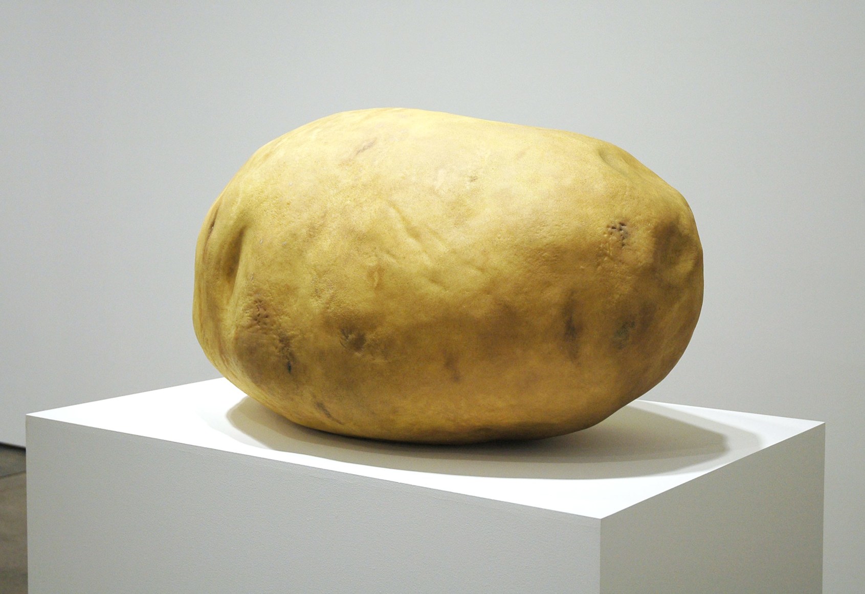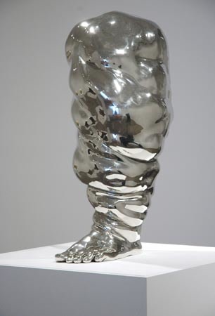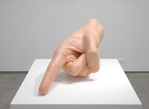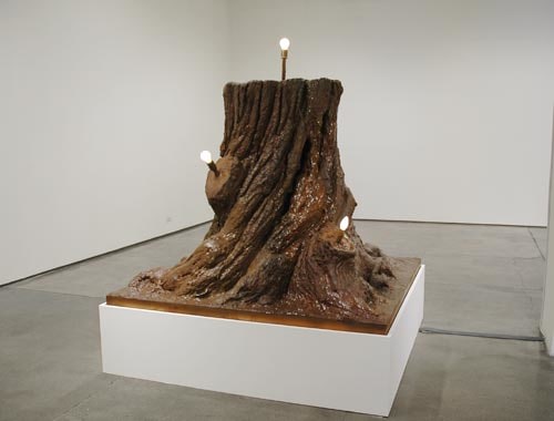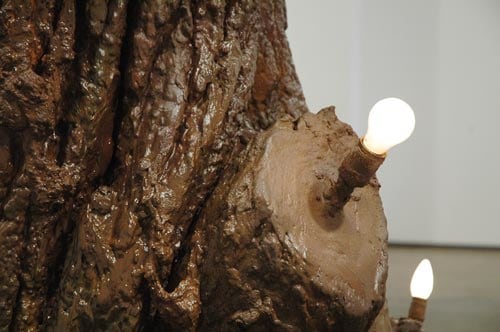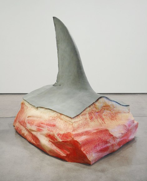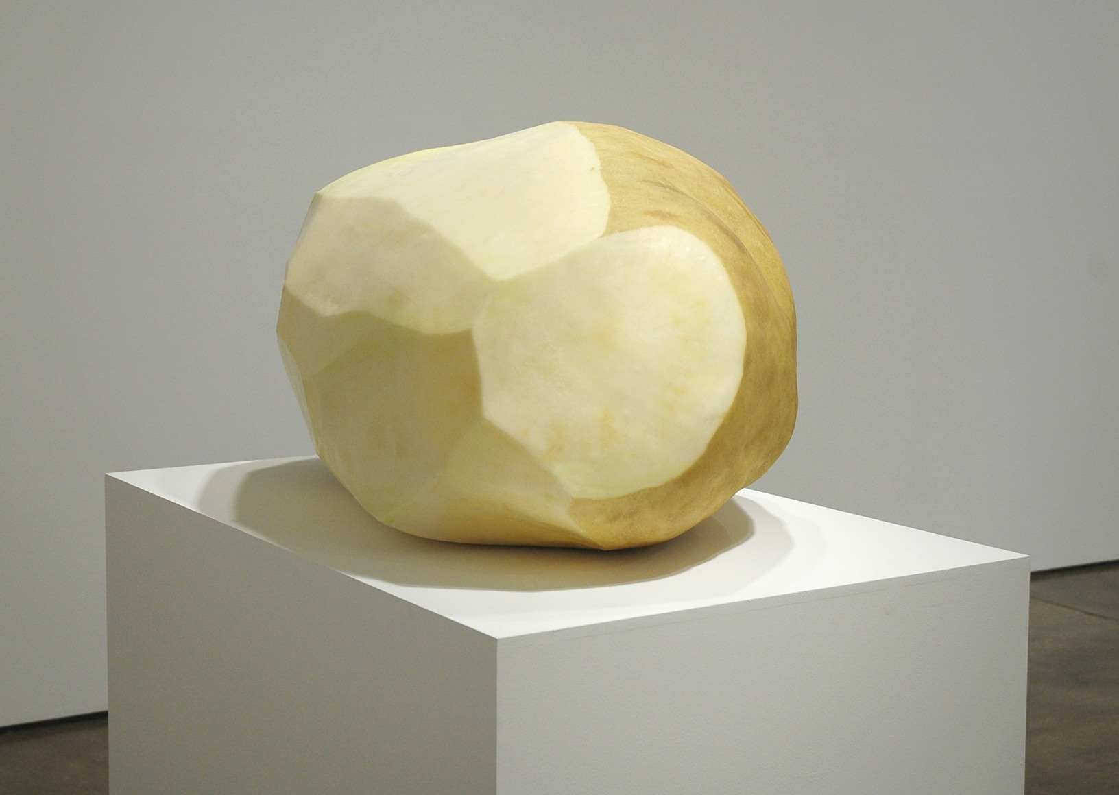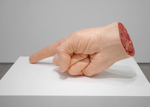 A highly polished bronze sculpture of a flabby leg is both seductively elegant and repulsively abhorrent. In contrast is an over-sized half-peeled potato made from wax representing an everyday action of something either half-started or half-finished. The powerful gesture of a giant pointing hand that seems to have tumbled down from a statue of some deity or historic ruler imbues it with an aura of the absent figure. A truncated tree made from plaster is lit with a meager light bulb sprouting at the end of each amputated branch and stands like a tragic lighthouse incapable of offering any guidance or safety. And, the imposing sculpture of a bloody shark fin severed from the formidable predator serves as a cultural icon of fear, terror and irrational belief.