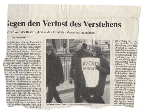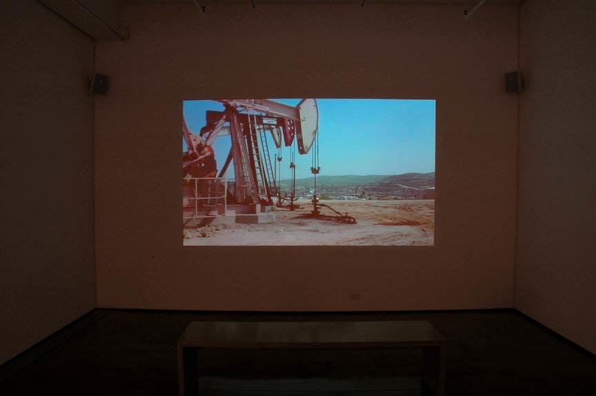 Impossible Dreams, a series of prints reproducing found newspaper cuttings about protest with Isaacs' own photographs inserted, forms the backdrop to the exhibition. Isaacs dreams of a world in which thought precludes action, in which the theme of protest melts away from the dialectical to the everyday emotional landscape of the individual elevated to the societal. Also on view will be a film shot on location at a California oil field showing an army of archaic looking machines appearing like animated behemoths unceasingly extracting resources from the earth. These oil pumps unceasingly and rhythmically go through the motion of extracting oil from the earth. Isaacs documents their movements to show them as they are, objects that look like something from our technological past, crude machines doing a crude job. The hypnotic quality of their incessant movement, is like the open road itself, seductive and ever moving, but after a while one begins to feel a fear creeping up ones spine…what if the movement were to stop.