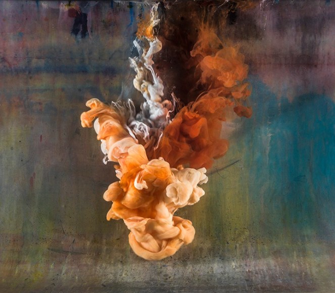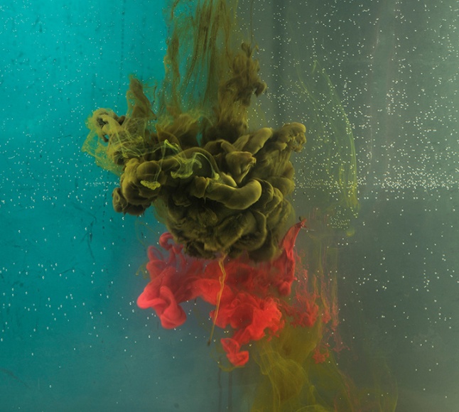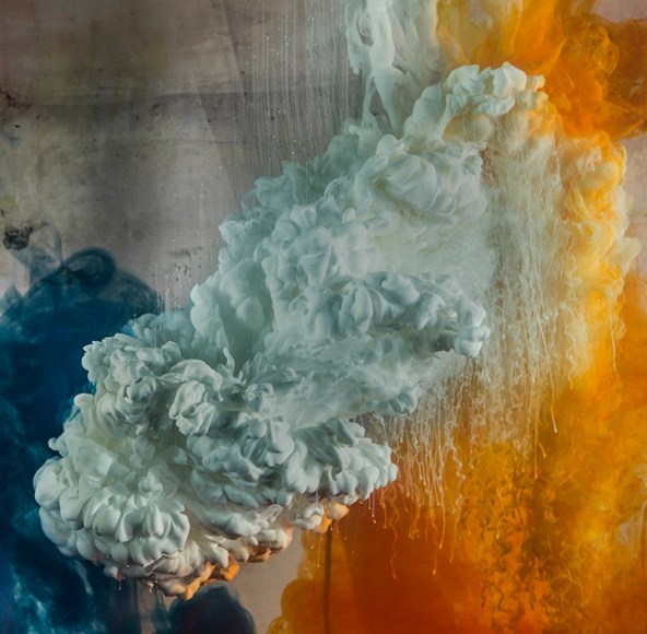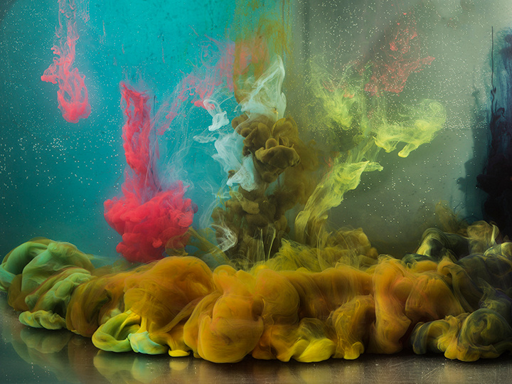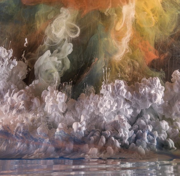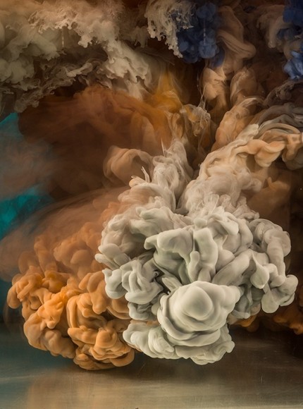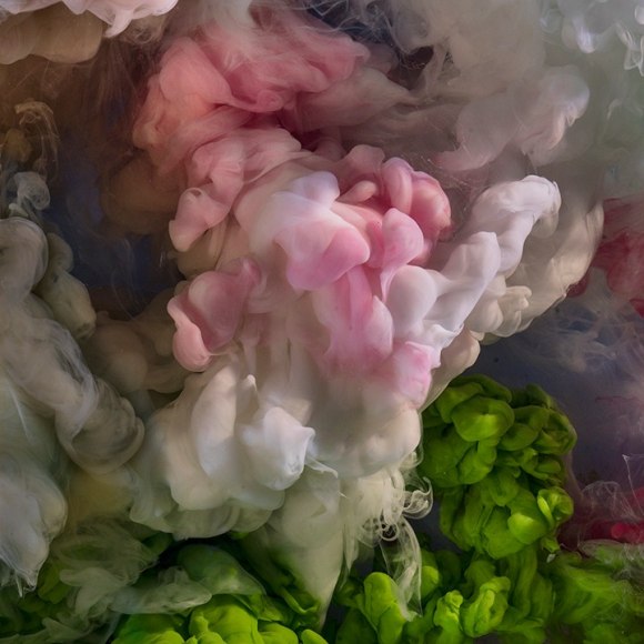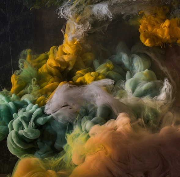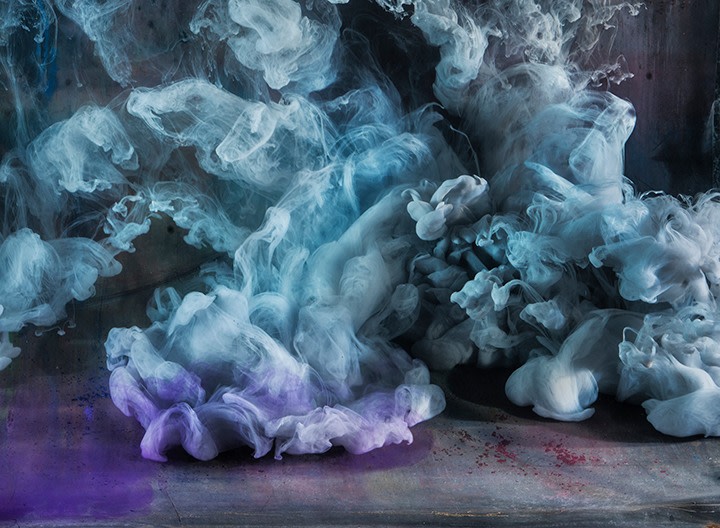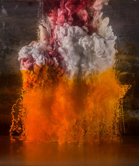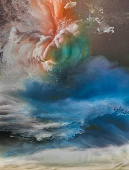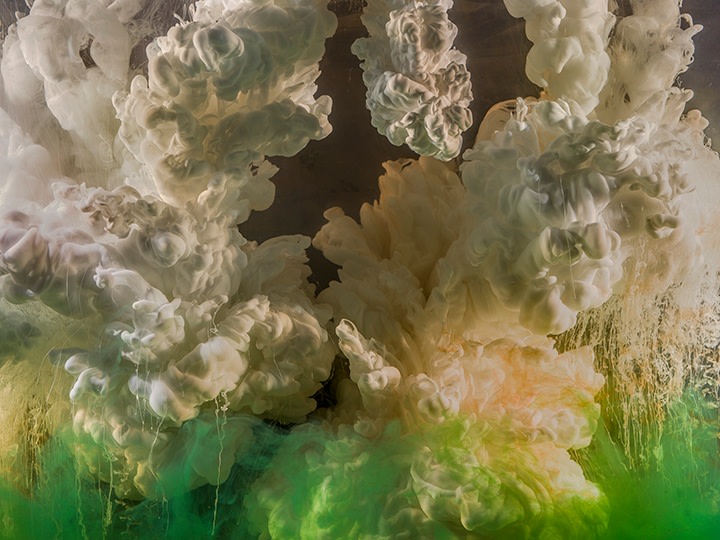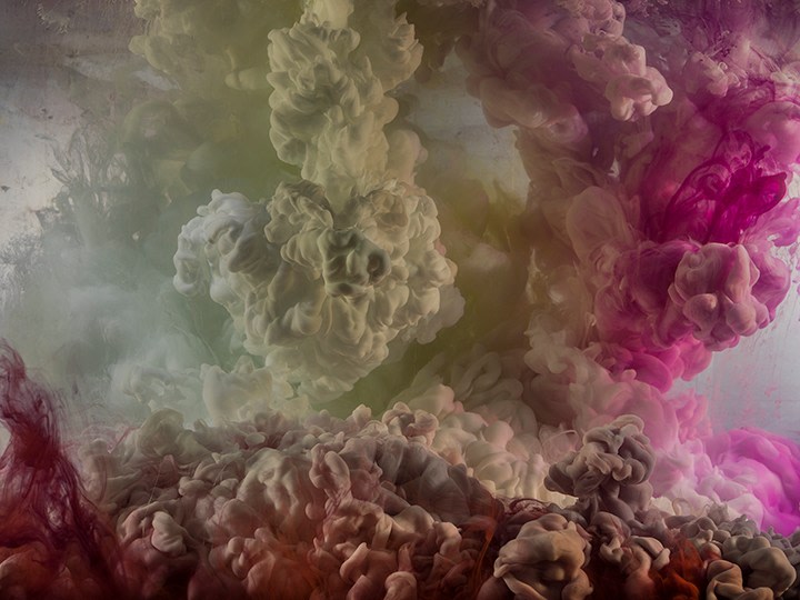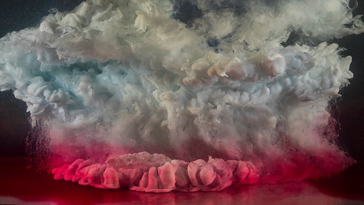 Kim Keever is well-known for creating strange and atmospheric photographic images by pouring paint into a 200-gallon tank of water and photographing the colors as they disperse and come back together, creating spontaneous images that evoke earthly clouds while also remaining abstract and alien. The works are mysterious and ephemeral, creating a nuanced and dreamlike space that bridges the real and surreal. The process produces billowing blossoms and explosive clouds of colors that he must quickly capture with his large-format camera.