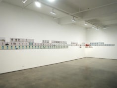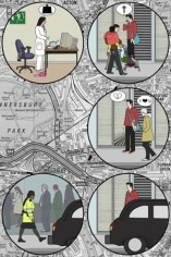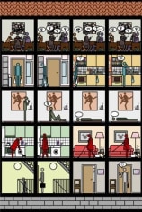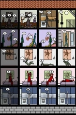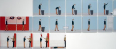 Arrhenius often uses pictographs, the kind of stereotypical figures and universal symbols seen on public information signs. A direct use of media, and a judicious blend of austerity and irony are typical of his work. The digital characters in his animation, The Street, create an exaggerated view of daily routines, where each individual contributes to keep things going like an anonymous cog in the machine of life. Arrhenius' hermetic but familiar world is propelled by a momentum of the mundane that insistently plods onward. In another work entitled Habitat, in which a five-floor house is represented by the stacked rows of 43 C-prints, we view a sequence in the lives of 10 people breaking down the archetypes and representing the possibility of personal choice and eccentricity.