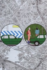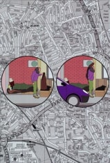 Reminiscent of the work by his late fellow countryman and proto-Pop master, Öyvind Fahlström, the world map of Arrhenius' WWW is overlaid by a cast of players who are interconnected through a cacophony of cause and effect type dramas. Arrhenius' humorous use of onomatopoeia creates a chain of events that link the sounds we read to a series of actions and consequences. In another work titled A-Z, Arrhenius superimposed a progression of encircled and intertwined stories over an enlargement of the classic London street guide.