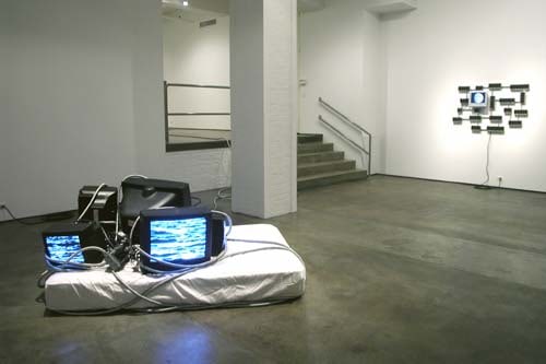 "Adrift" is composed of five complementary works with wandering electrical cables linking each piece to the next. In the front Gallery, "Raft" consists of a floating mattress and a pile of tethered televisions all with images of ominous and constantly shifting seas. It is an inverse reflection on Gericault's "Raft of Medusa" and makes the viewer conscious of the overpowering forces of nature. Nearby a diagrammatic composition of conduit and clustered receptacles hold up a flat screen with a large image of the moon at night. At first appearing forever bright and present, it slowly fades into the darkness.