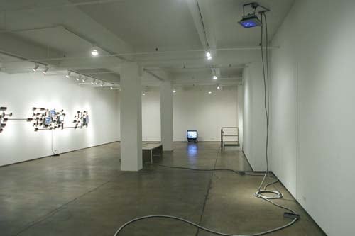 In the main gallery, clambering flexible cords ascend to the ceiling where a monitor broadcasts footage of an astronaut losing himself to deep space. In the back distance a single TV shows a tissue covered apple tree blowing in the winter wind, suggesting the sail of a ship on the horizon. The most expansive work in the exhibition is a 25-ft. long wall sculpture made of rigid conduit and electrical outlets--a Mondrian-like "Broadway Boogie Woogie" grid of a logically ordered world. This entangled support system gives power to five flat screen televisions, creating an abstract skyline of New York vignettes. Audio tracks from each piece combine to form a fusion of sounds ranging from crashing waves and howling wind to late night talk radio and a melancholic piano composition of Eric Satie.