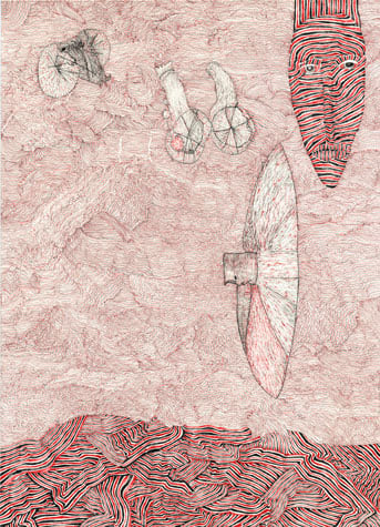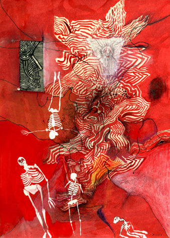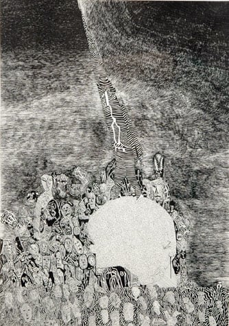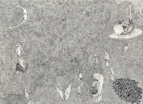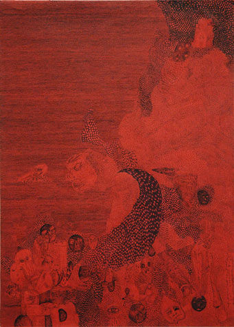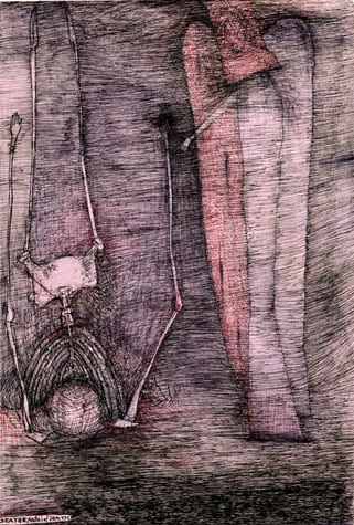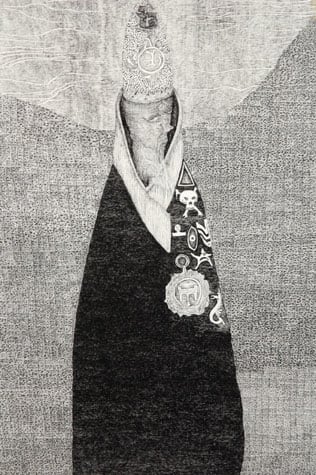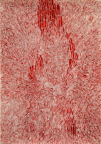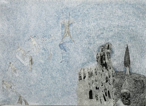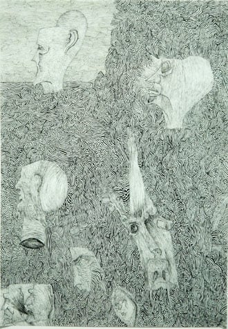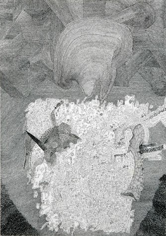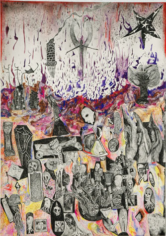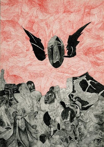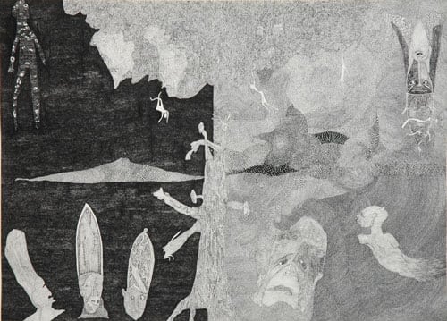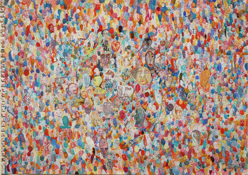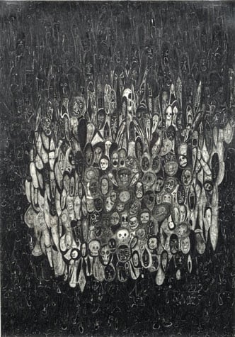 Nick Blinko draws intensely dense and detailed compositions of faces, figures and obsessive patterns, which at times also incorporate fragmented phrases. Diagnosed as suffering from schizophrenia, and in the past hospitalized, Blinko creates his pictures when not taking therapeutic medication that adversely affects his ability to work. His art conjures a nightmarish, anxiety-ridden world where inner demons might be exorcised through repetitive graphic marks. Out of thousands of tiny flecks and dashes emerge elaborate visions of skeletons, mysterious symbols and religious figures. Reminiscent of the macabre images of Goya or James Ensor, Blinko creates a personal iconography that evokes the magic and menace of a rich imagination.