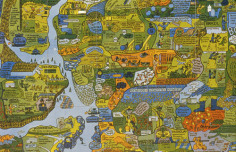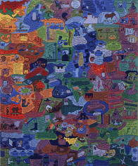 Following his idealistic vision of making art that was more accessible, Fahlström dedicated himself to the populist practice of making multiples and graphic works. Cartographic and diagrammatic, these politically oriented works read like rebuses, merging dense information with obsessive cartoon-like imagery and formal pictorial invention. Employing systems and strategies found in maps, puzzles and games, Fahlström created his own visual language that critiqued globalism and promoted utopian ideas. He highlighted current events and investigated political, social and economic concerns in visually complex works of art.