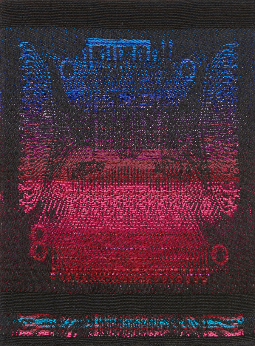 Hand Jacquard woven wool, chenille, hand dyed cotton and metallic yarns
