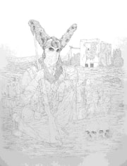 In stark contrast are Adam Helms' desolate environments sparsely populated by desert rabbits and mercenary soldiers of fortune. Amid the dust and rubble, attenuated figures bend to survey the wreckage, plot their coordinates, and prepare to take a bead on the irradiated beasts lurking behind the nearest windswept mound. They exist in a fictional world of drawings, but one that seems familiar--one with a political past and current conflict, one "populated with empathetic characters and the artifacts of a subcultural pathology", and one where perhaps beliefs are long defended and ideologies continually promulgated.