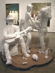 Are you ready to be converted? Brought into the fold? Besides your punctual attendance and rapt attention, the requirements for novitiate status are surprisingly few. You must, however, be willing to share Gina Dawson's enthusiasm--no, call it infatuation shading into a crush--for John Ritter. The late actor is depicted here by Dawson in a tableau with his father, the Country & Western star (and relentless proselytizer in his own right) Tex Ritter, and his trusty horse, White Flash. They are joined by Dawson herself, who sits on the Three's Company star's lap in dreamy-eyed supplication. Instead of Remington's bronze, Dawson uses a faux marble finish. All the better to neo-classically memorialize a "classic" sitcom and physical comedy genius.