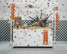 Still not ready to succumb? Perhaps SunTek Chung can be your temporary shepherd. The Korean-American photographer has outfitted himself as a cricket player in a kung-fu ready pose. He stands in front of a Pagoda altar tricked out in a pleasant Laura Ashley print, clutching his bat like a kendo sword. Worlds collide, not least the neo-colonial sport of cricket with the pop-imperialist fascination in all things Hong Kong action. Chinese, Japanese, Korean, American, Indian, and Pakistani: Chung is a nun-chak thumping photographer in high Pentecostal fever.